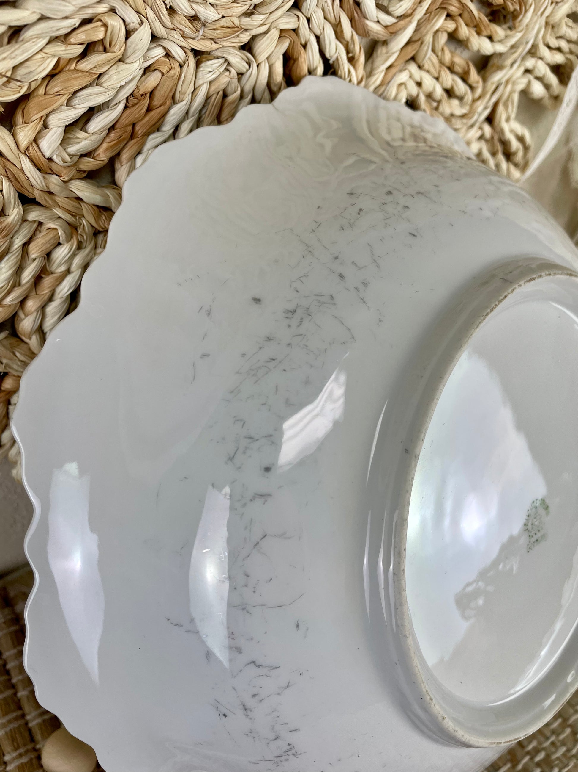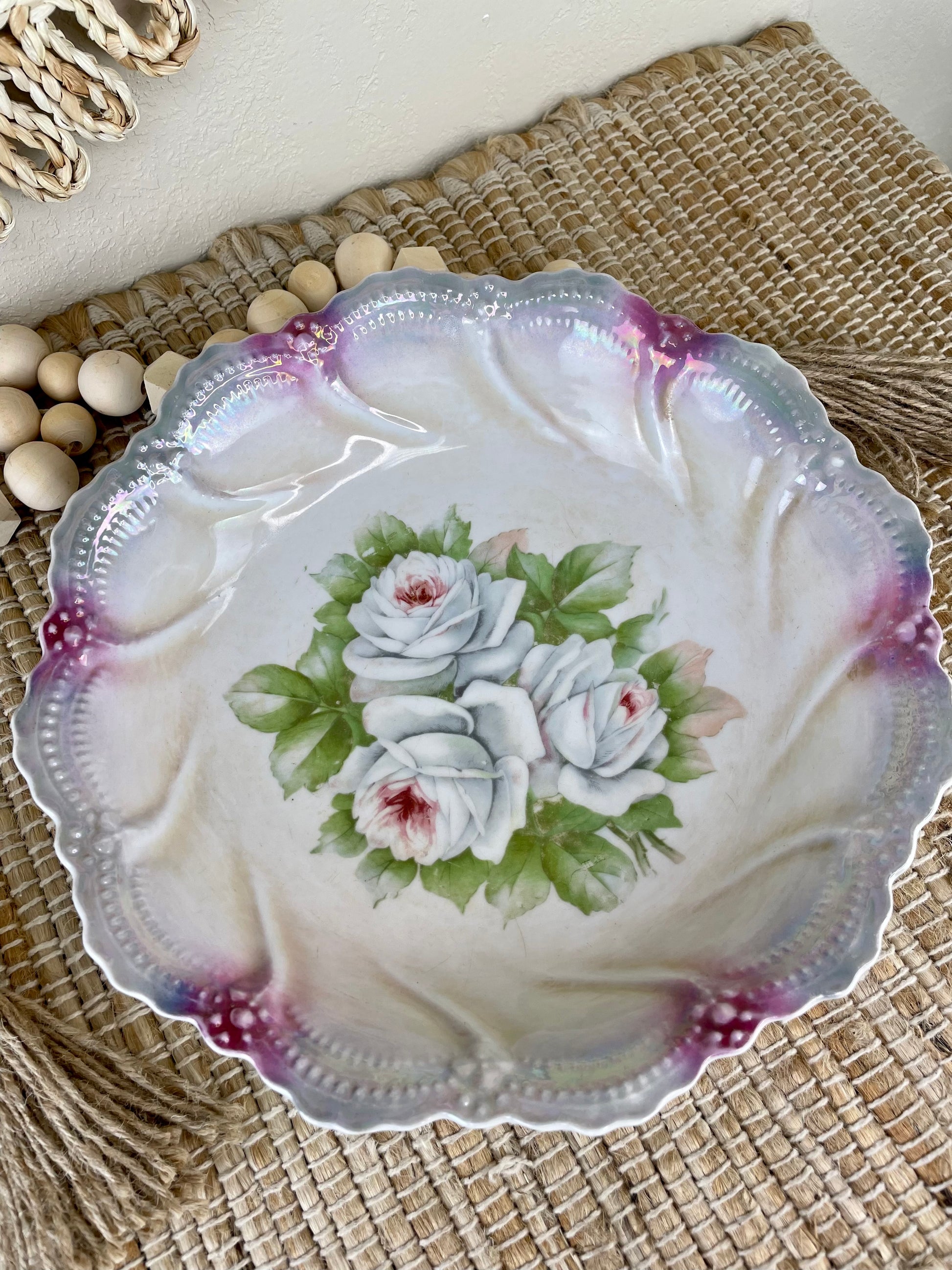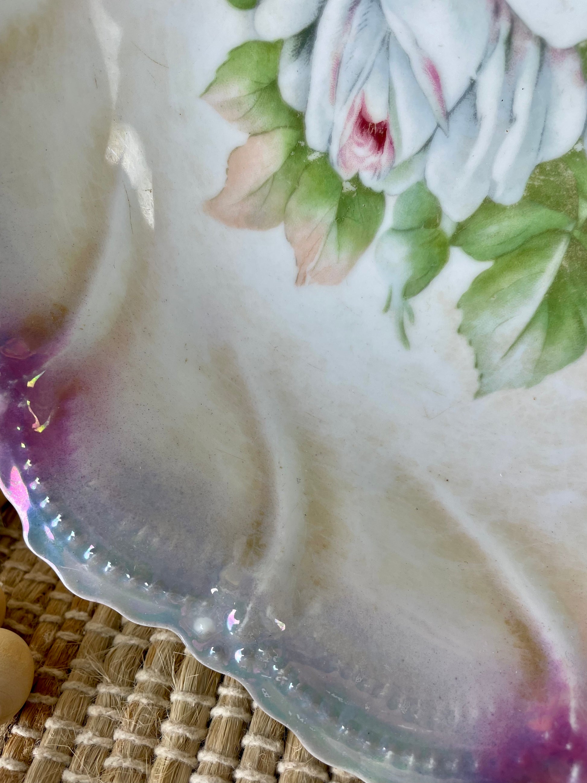 This antique serving bowl is beautifully designed with a floral design in the center and iridescent glow towards to outer portion of the bowl. Complete with pink and gray color alteration on the outer edge and detailed ridges, as well as a scalloped edge all the way around. This piece is in used vintage condition and does show some signs of wear, including slight fading on some of the green leaves and some staining on the back. There is a hairline crack on the bottom of the bowl that can only be noticed when turned upside down.