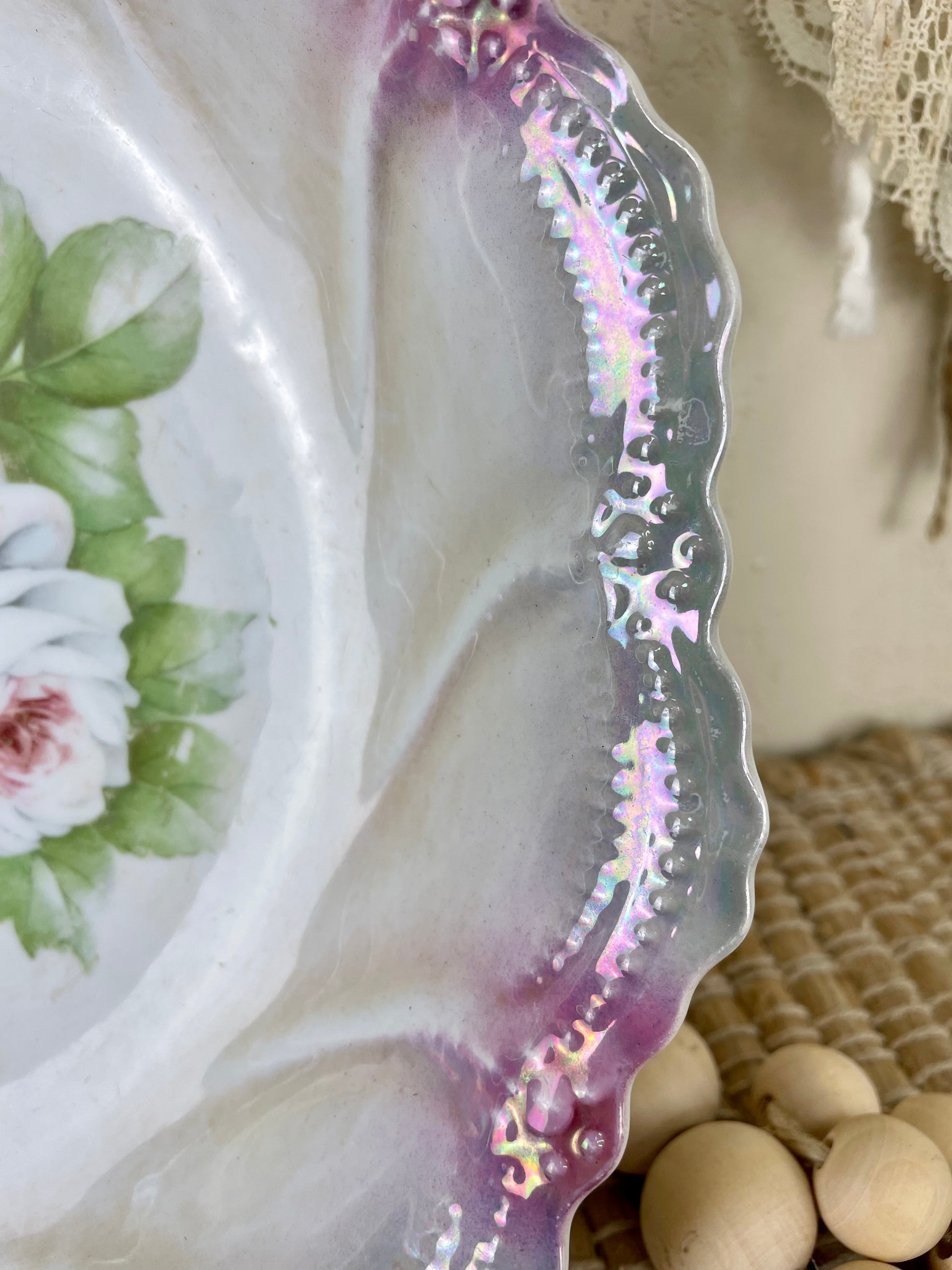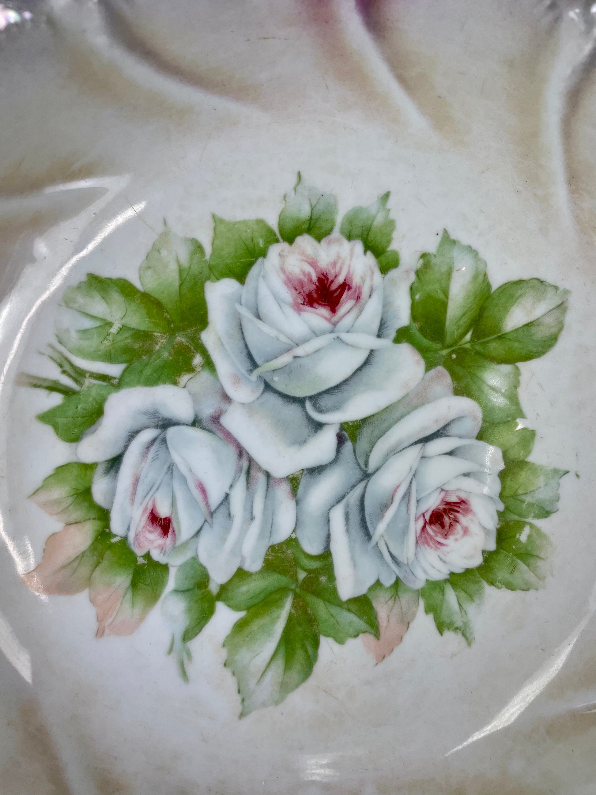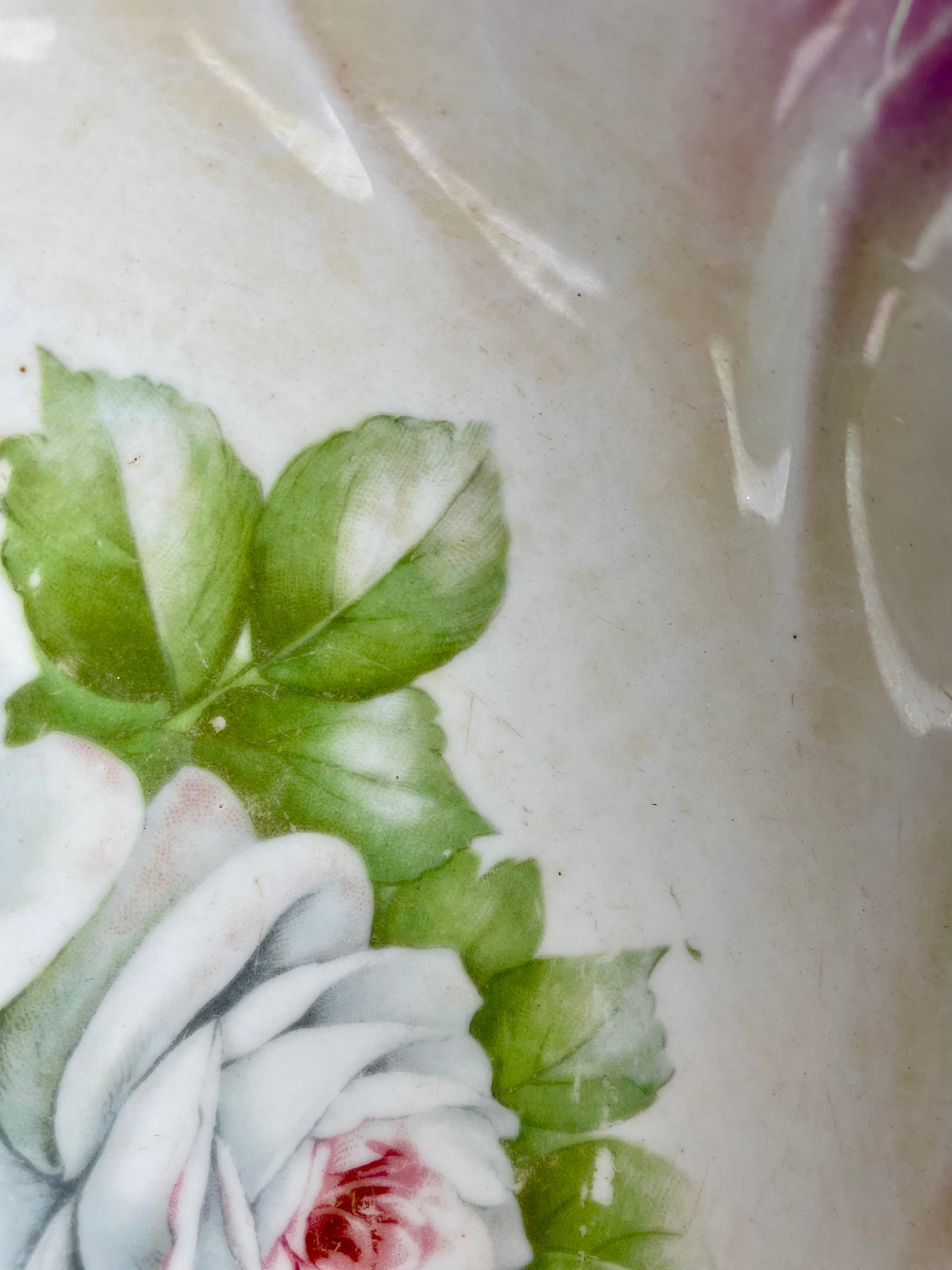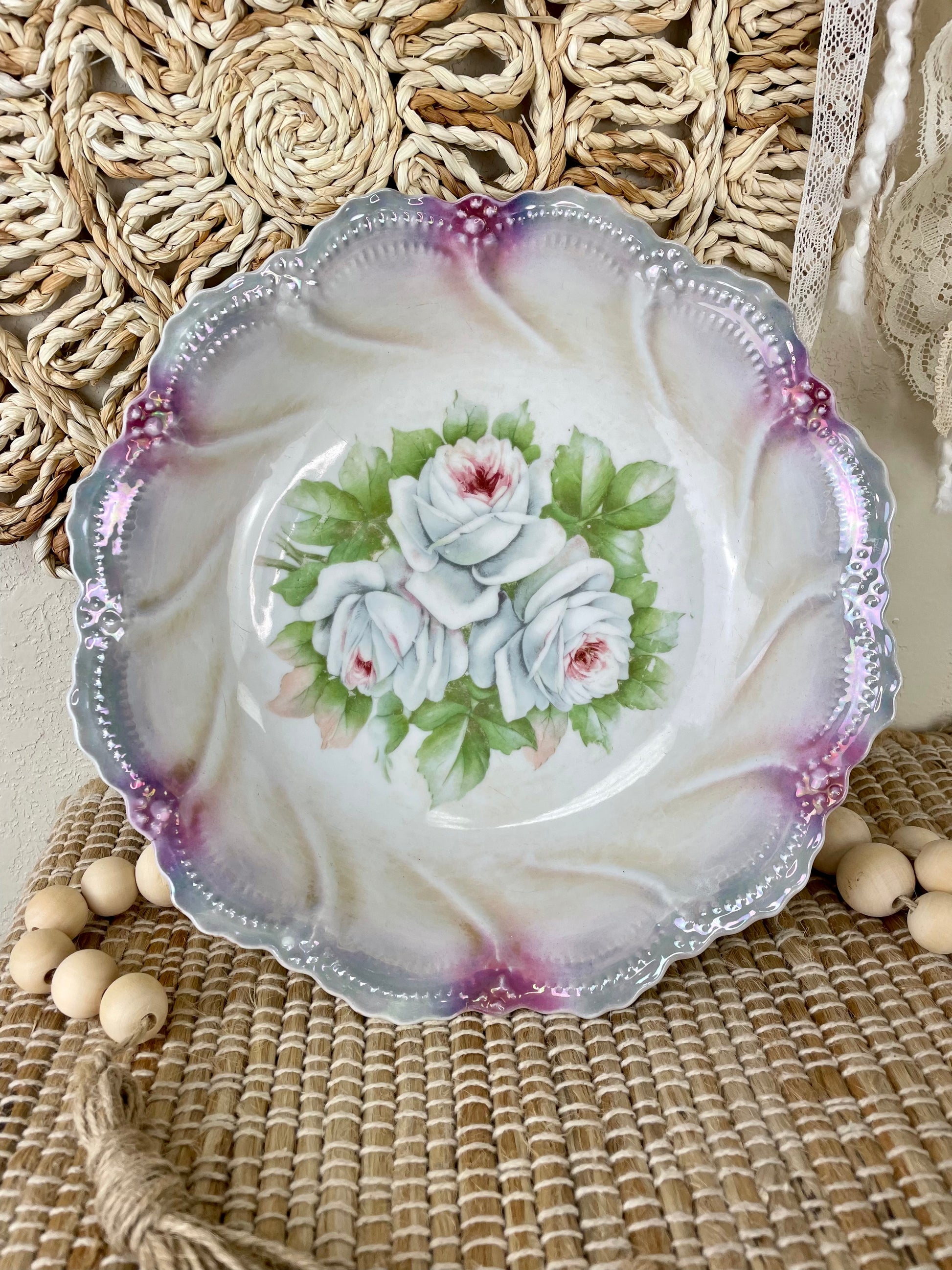 This antique serving bowl is beautifully designed with a floral design in the center and iridescent glow towards to outer portion of the bowl. Complete with pink and gray color alteration on the outer edge and detailed ridges, as well as a scalloped edge all the way around. This piece is in used vintage condition and does show some signs of wear, including slight fading on some of the green leaves and some staining on the back. There is a hairline crack on the bottom of the bowl that can only be noticed when turned upside down.