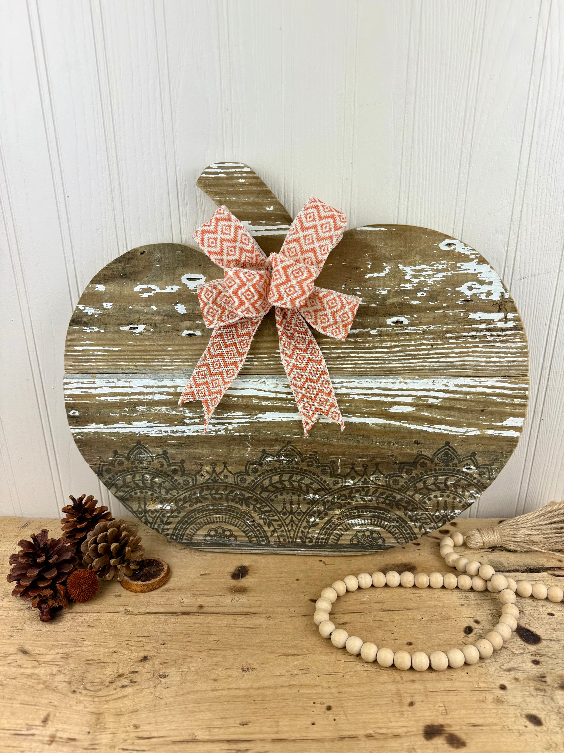 This handmade pumpkin is made from locally sourced Iowan barn wood with natural characteristics such as grain marks, splits, and small nail holes. Stamped with a black decorative design and accented with a bow. Complete with a wire hanger on the back for easy displaying.