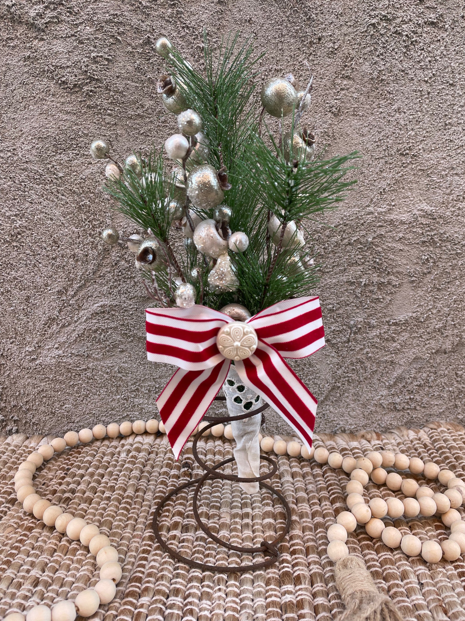 Handmade Christmas floral arrangement made from an upcycled rusty bed spring, vintage lace, floral accents, and adorned with a holiday bow.