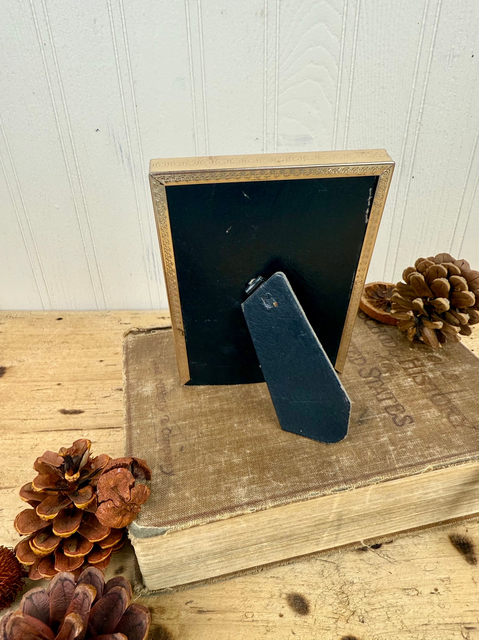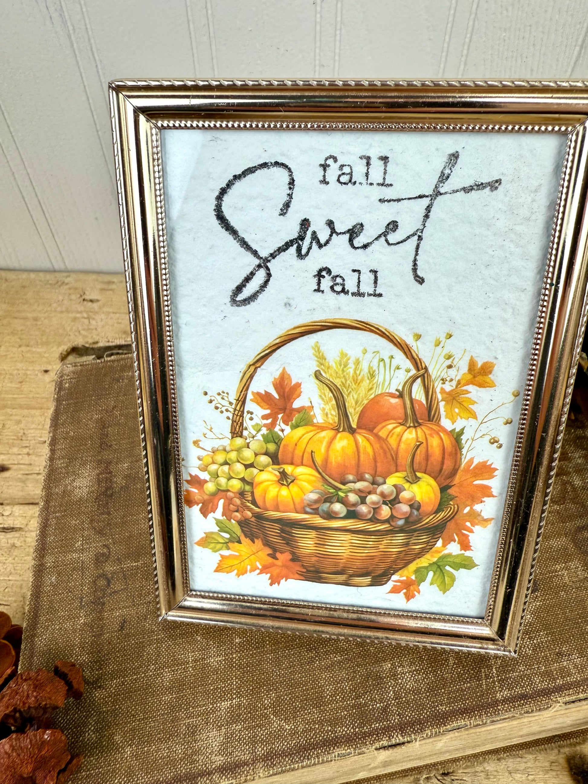 This unique piece features a vintage brass frame with an art image on handmade paper, displaying a fall basket and the words "Fall Sweet Fall". With the ability to remove the art and display your own treasures, it's the perfect addition to any room.