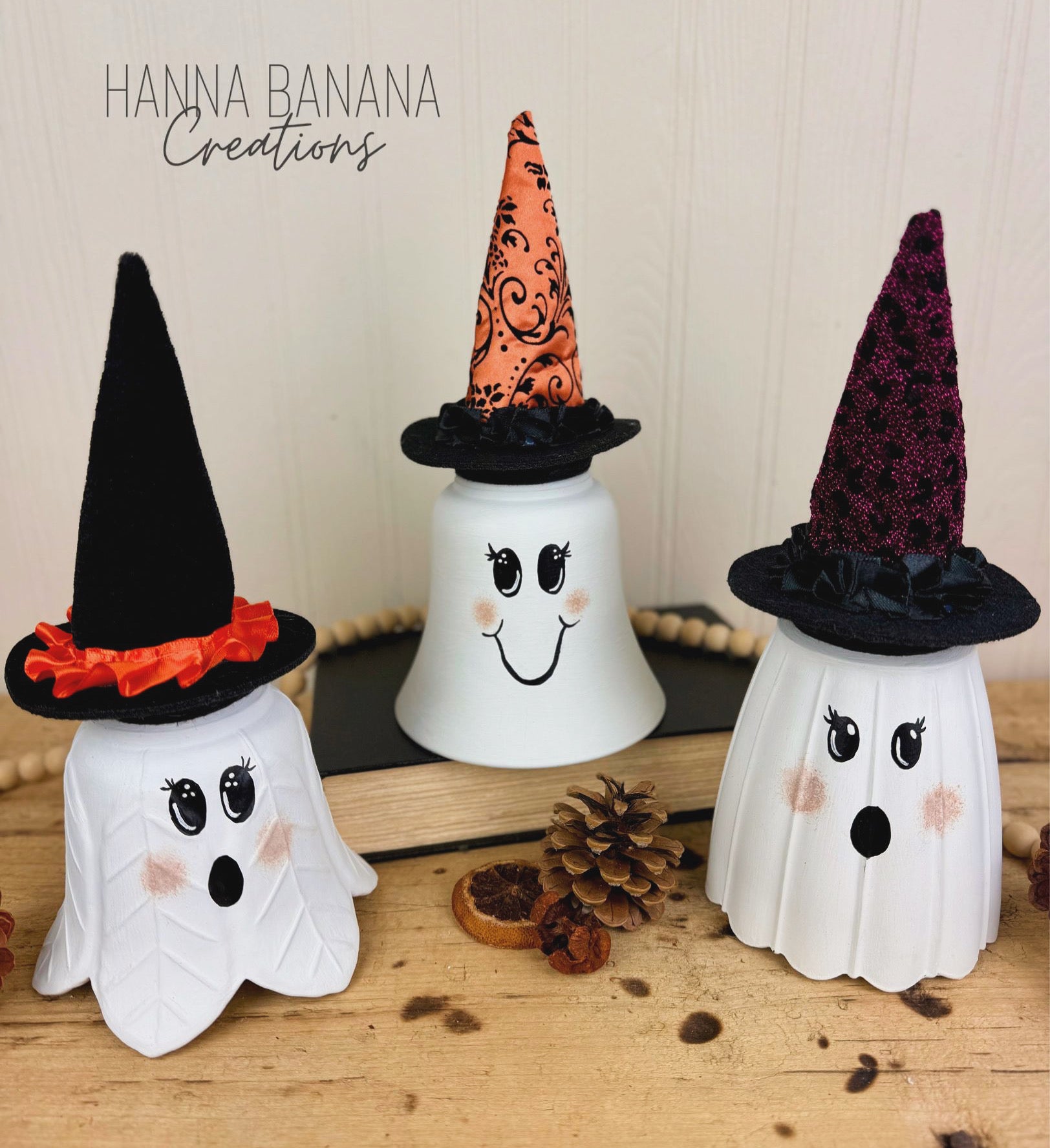 This unique Halloween ghost is crafted from an upcycled glass light shade and hand painted with intricate facial details. Complete with an adorable witch hat, this ghost adds a charming touch to any Halloween decor. Spooktacular!