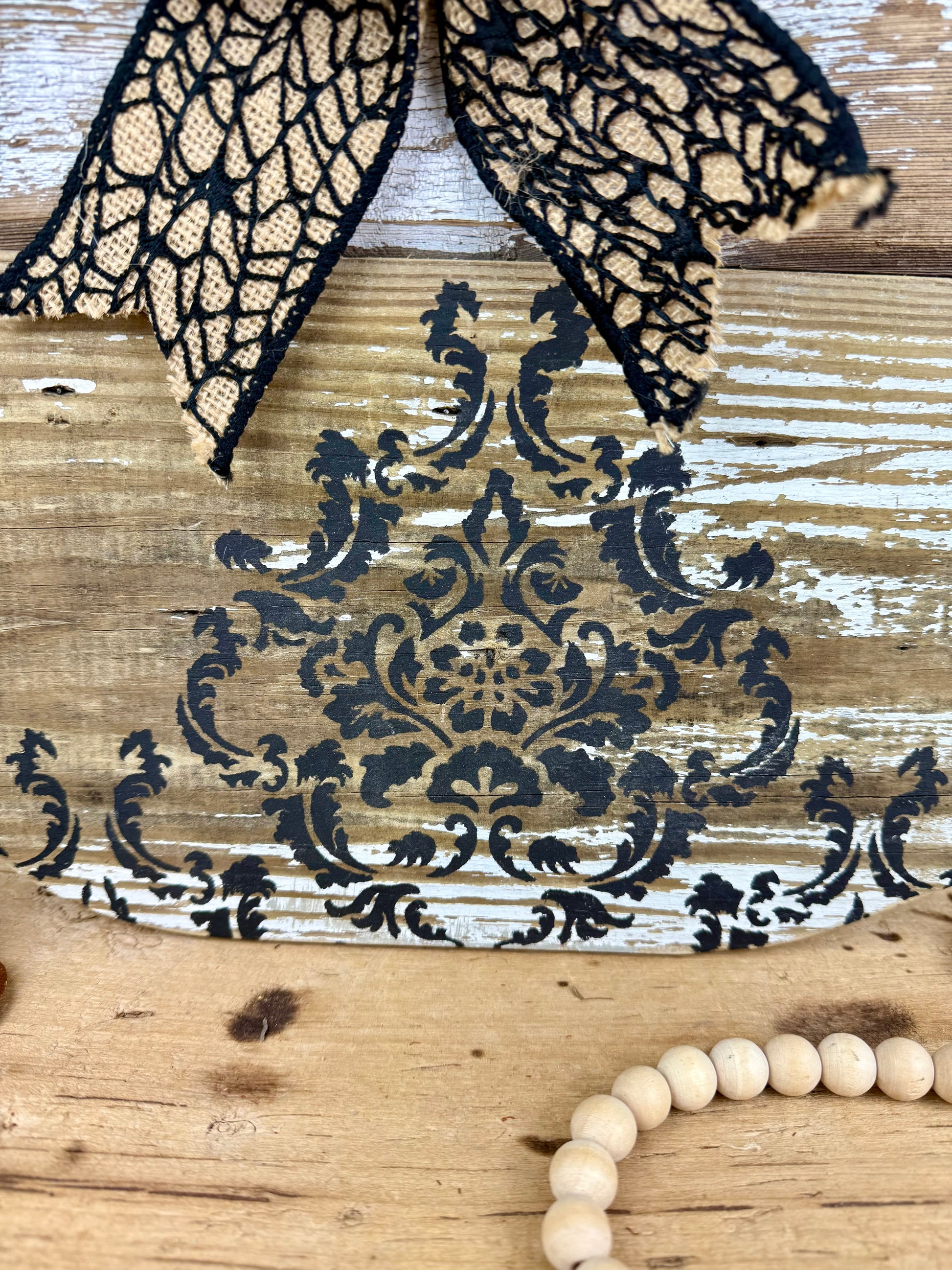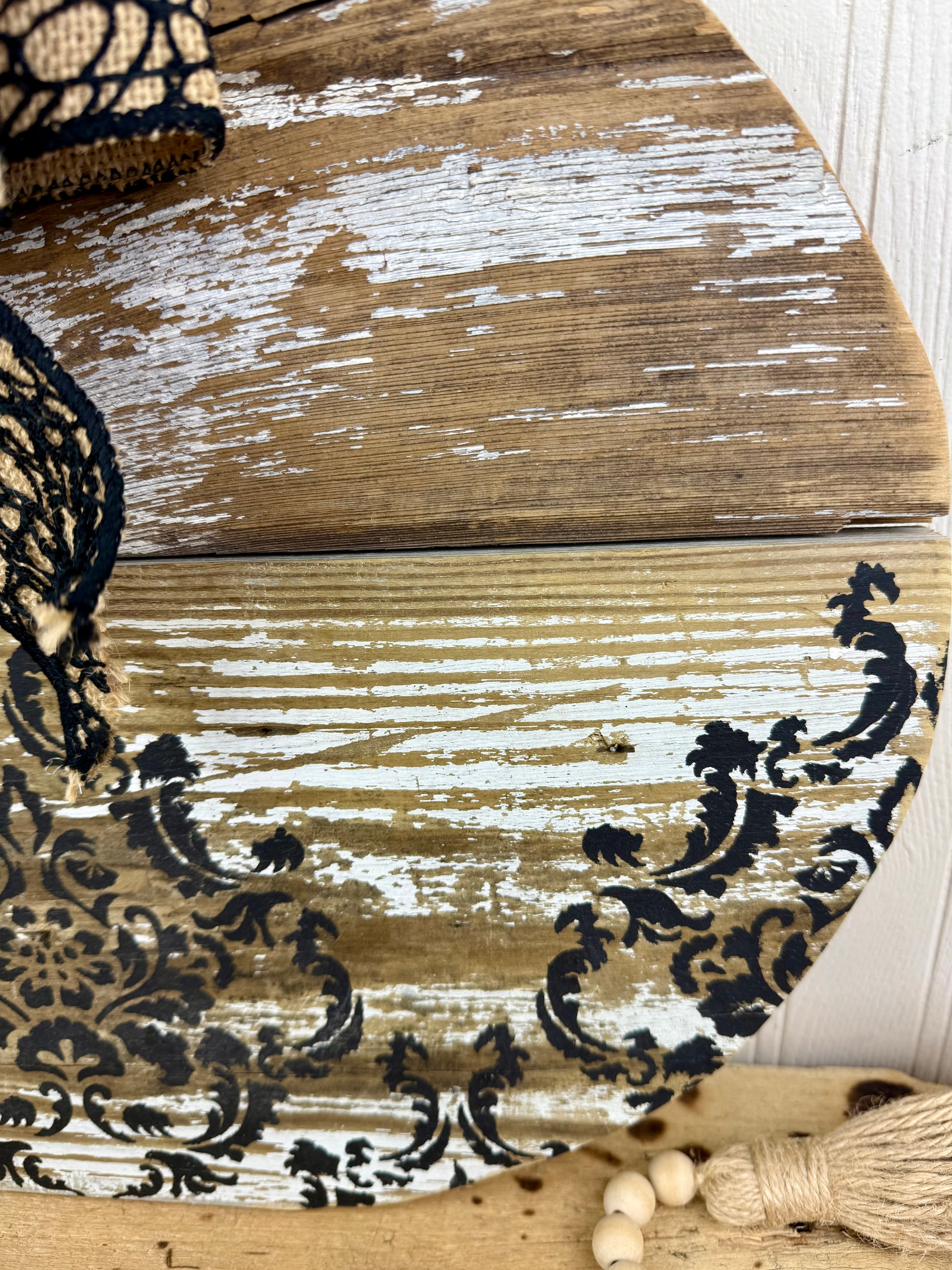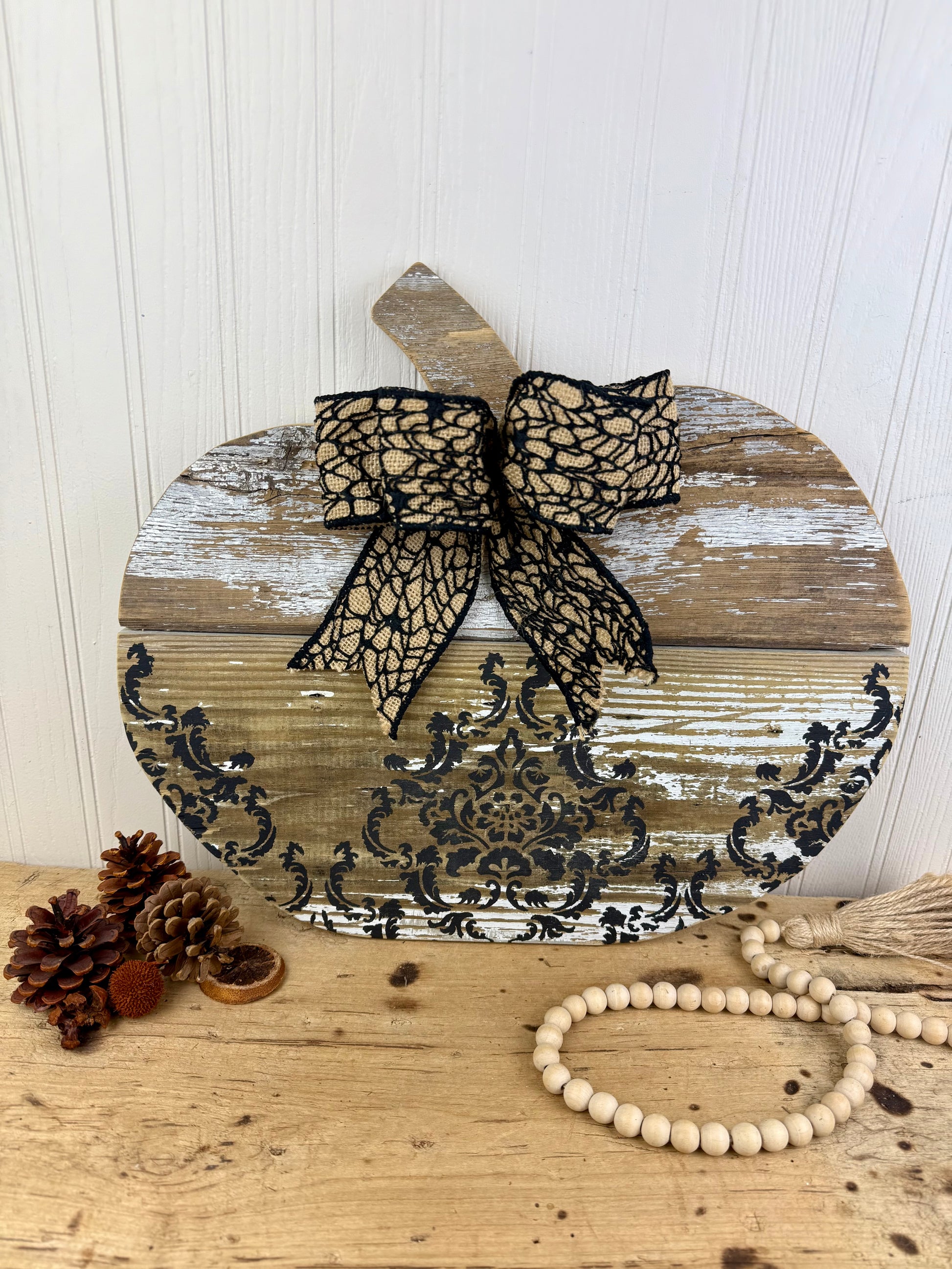 This handmade pumpkin is made from locally sourced Iowan barn wood with natural characteristics such as grain marks, splits, and small nail holes. Stenciled with a black decorative design and accented with a bow. Complete with a wire hanger on the back for easy displaying.