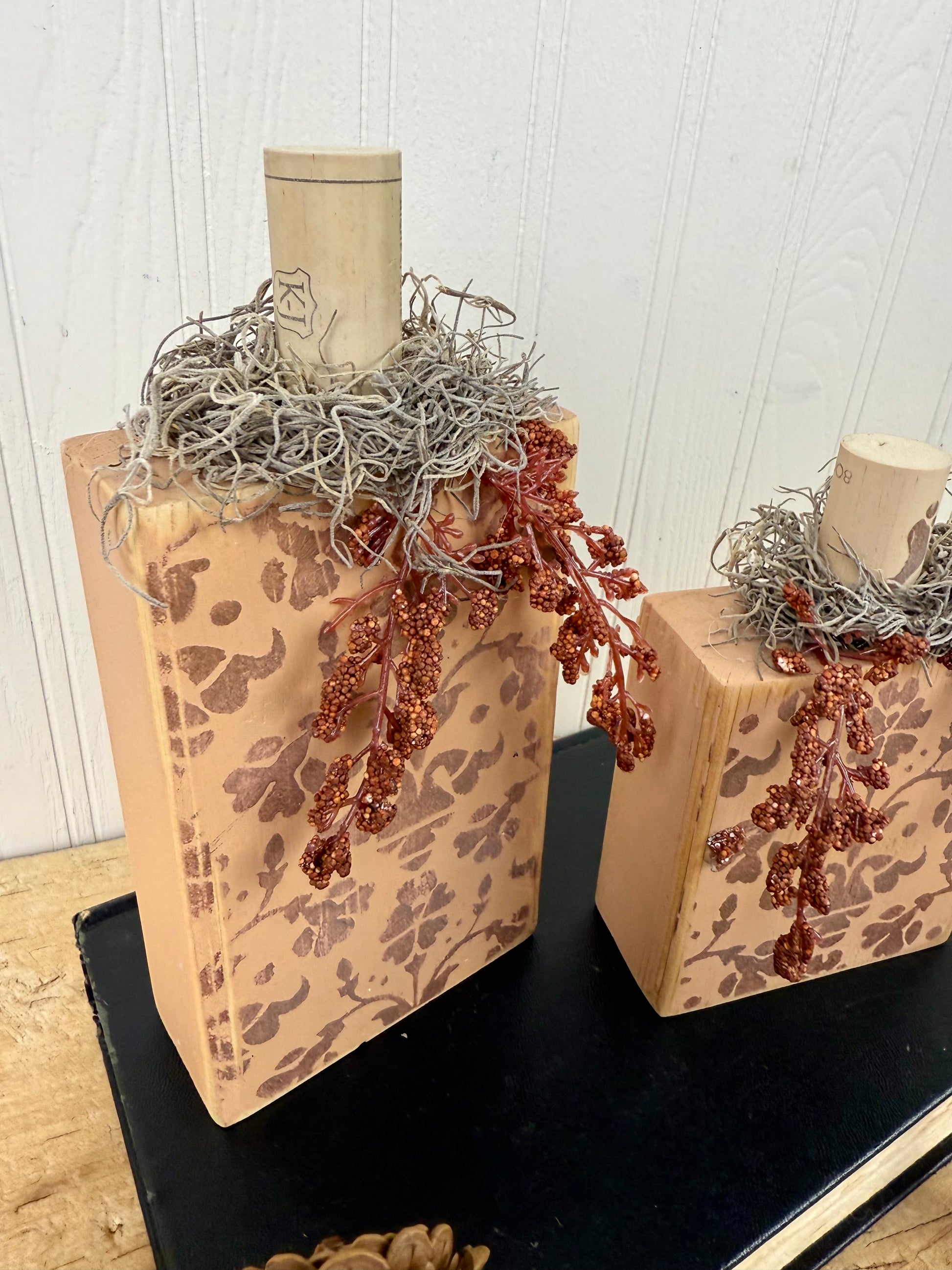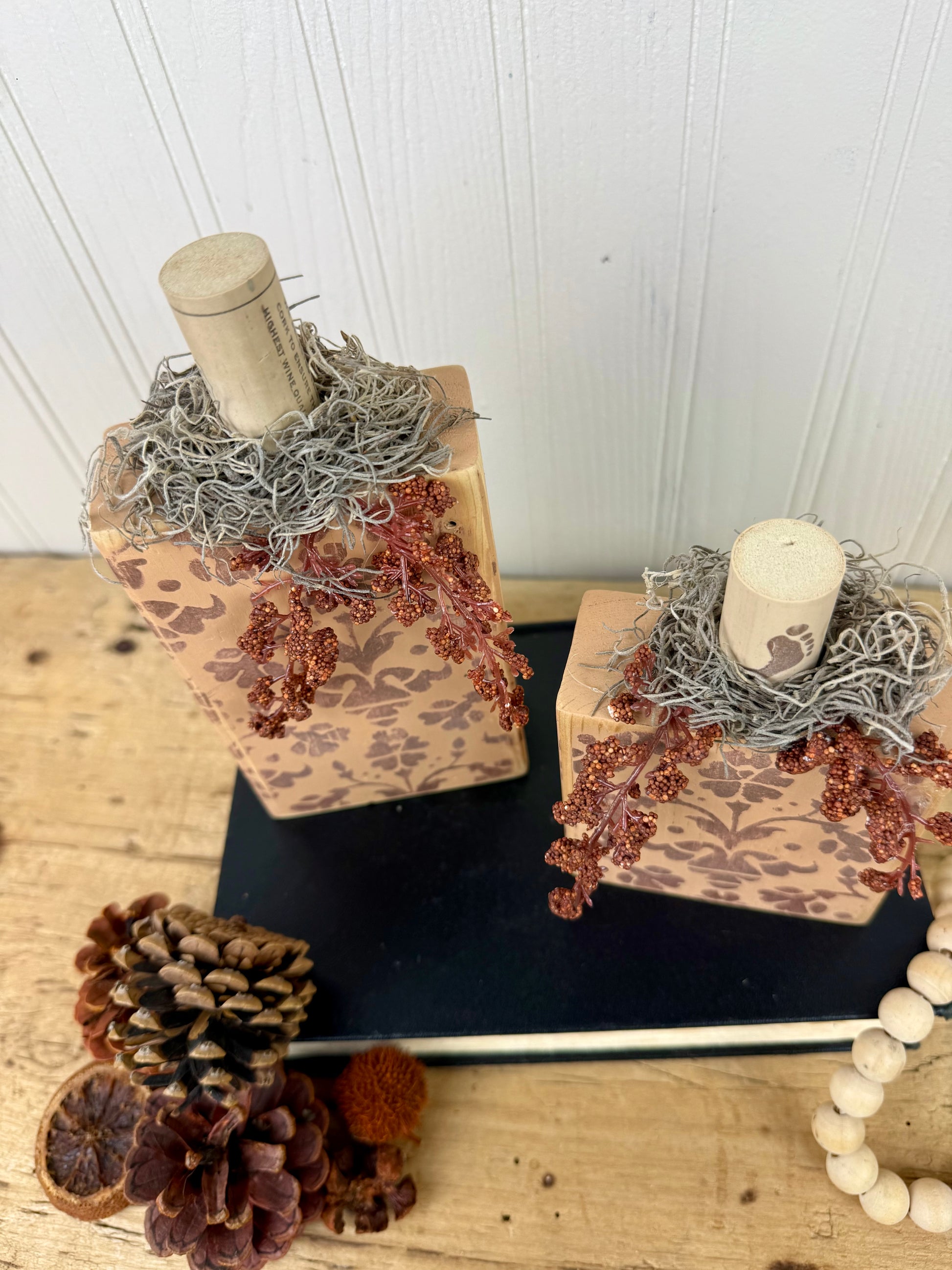 Handmade from reclaimed wood. Accented with a wine cork stem, Spanish moss, and faux greenery. Sold as a set.