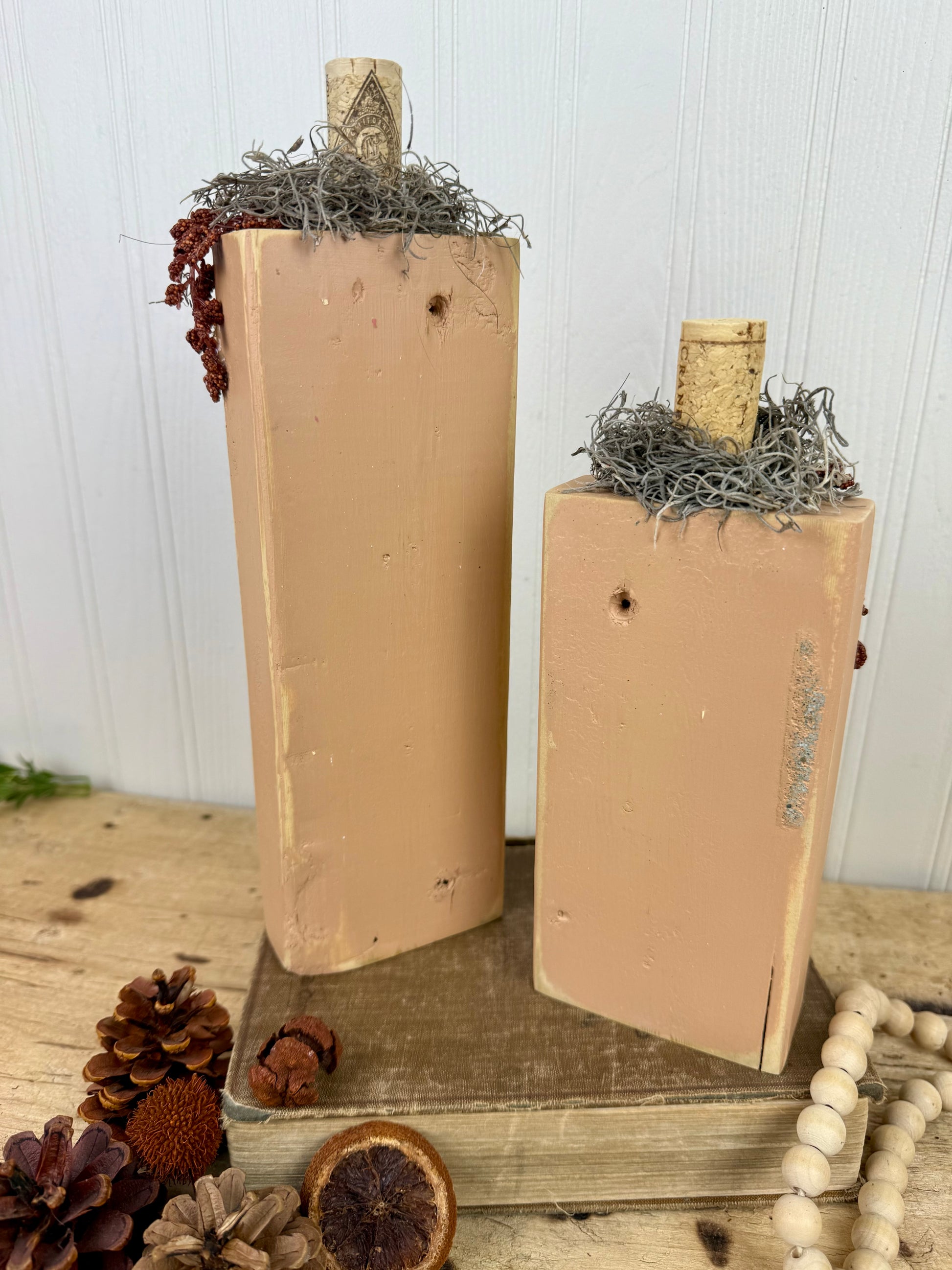 Handmade from reclaimed wood. Accented with a wine cork stem, Spanish moss, and faux greenery. Sold as a set.
