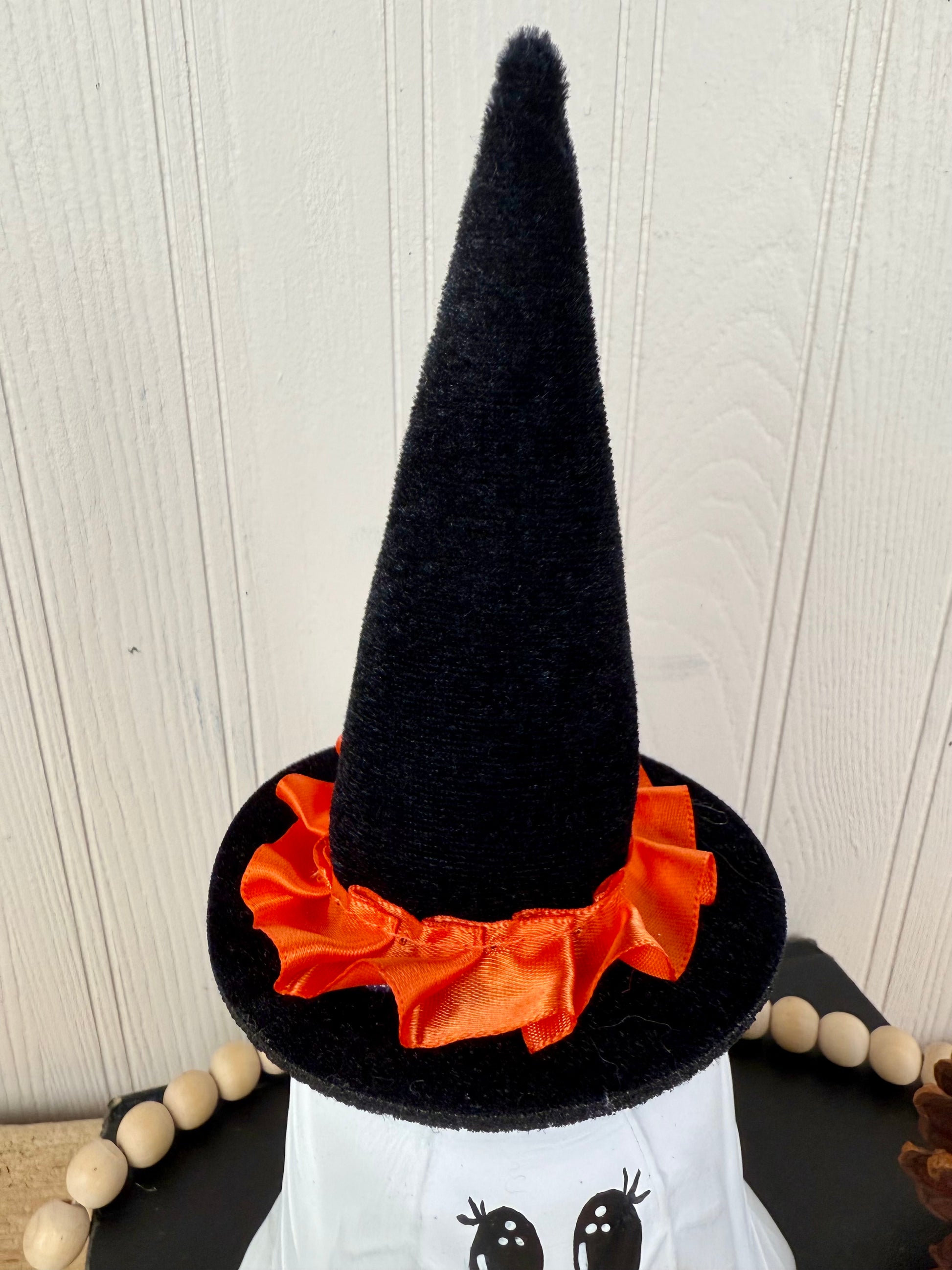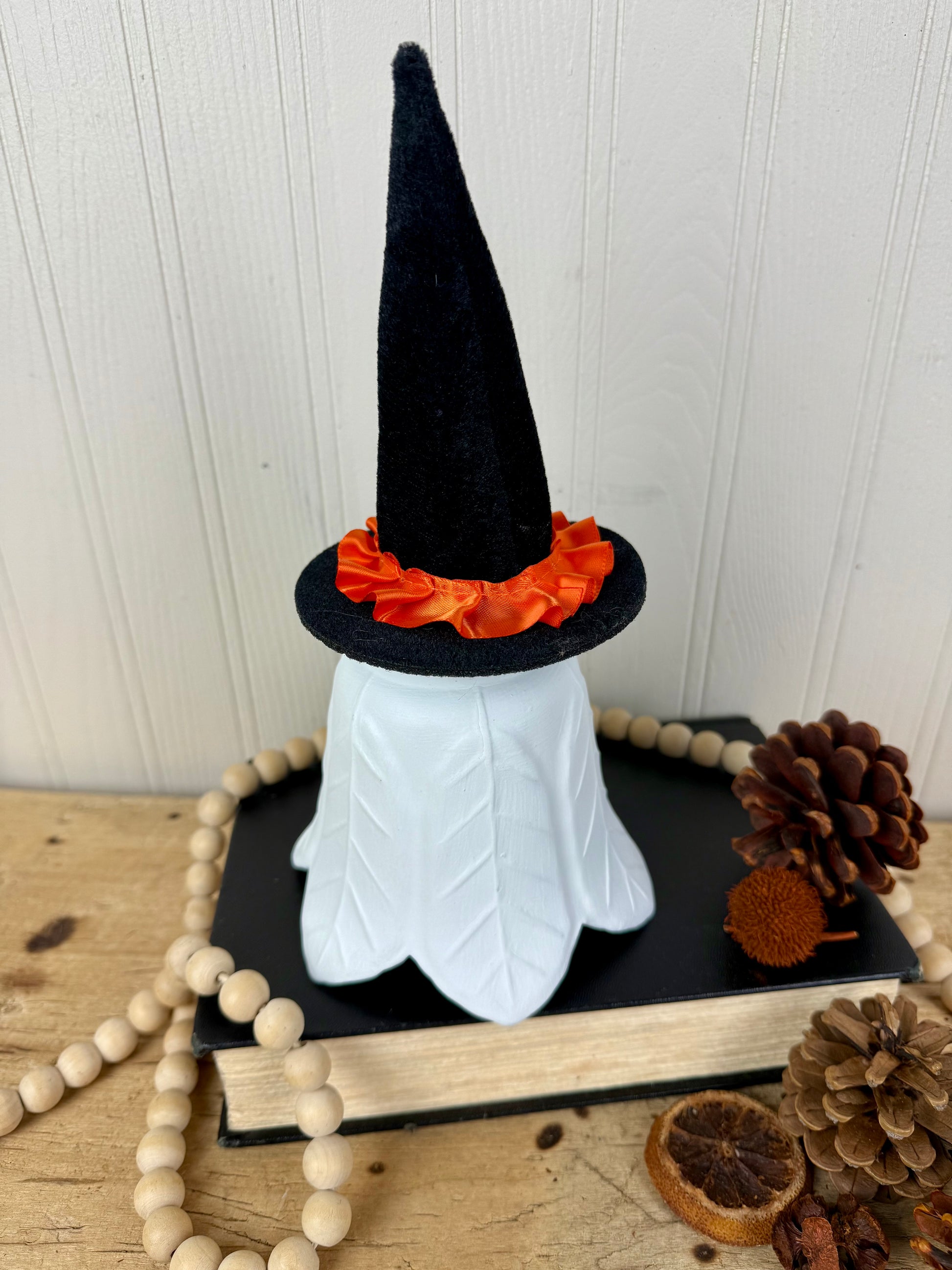 This unique Halloween ghost is crafted from an upcycled glass light shade and hand painted with intricate facial details. Complete with an adorable witch hat, this ghost adds a charming touch to any Halloween decor. Spooktacular!