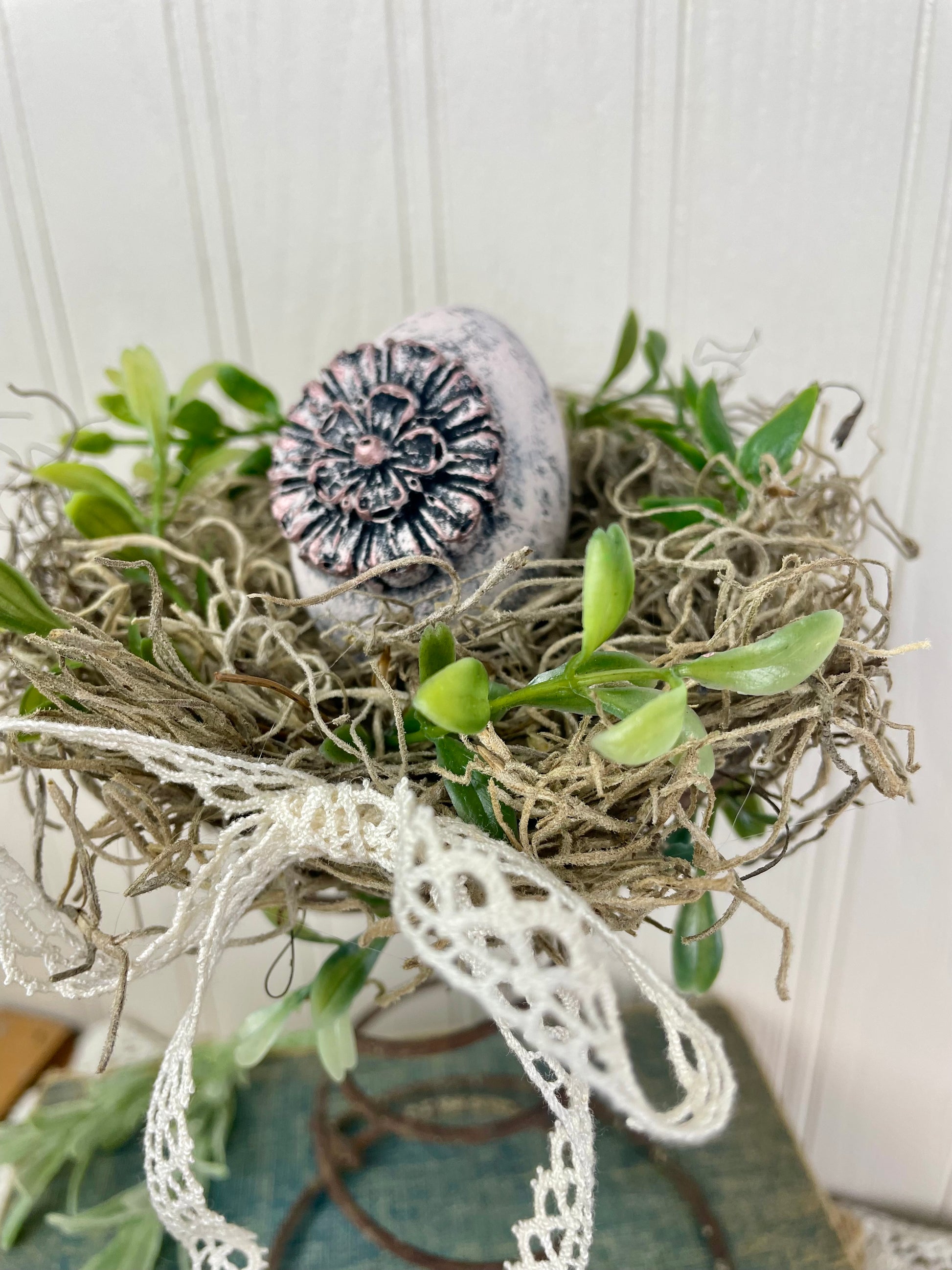 This adorable upcycled spring decor piece is handmade from a rusty bed spring with Spanish moss and greenery pieces as a nest and completed with a decorated faux egg. Accented with a vintage lace bow.