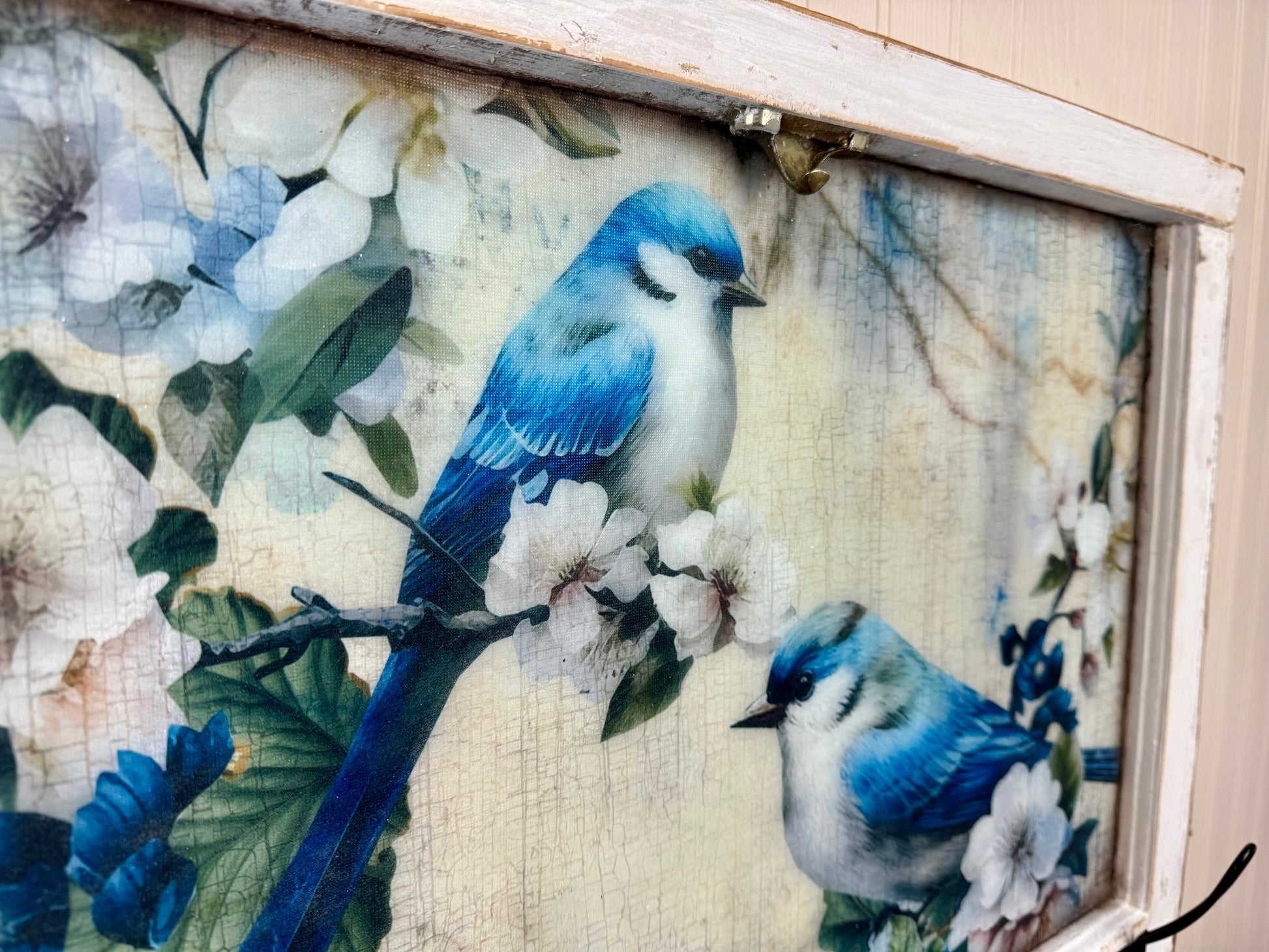This handmade upcycled wall art showcases a decorative image of spring blue birds decoupaged onto a rustic window. The aged finish enhances its visual appeal. It includes three hooks for versatile storage and heavy-duty French cleat hardware for secure wall mounting, ensuring durability and functionality. Shipping is included in the price. Please message or email me for local pickup options.