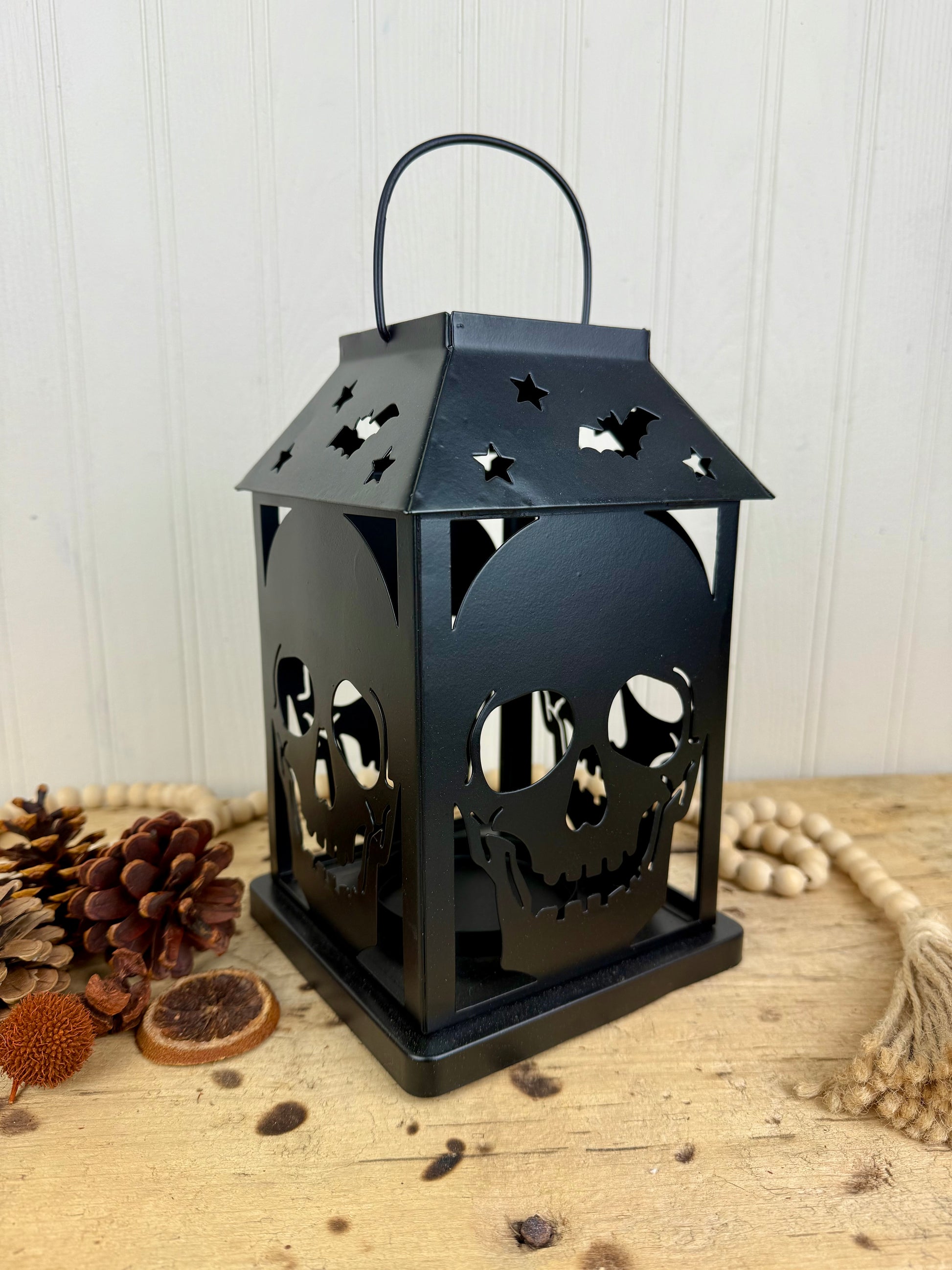 Illuminate your spooky Halloween decor with this candle lantern featuring a skull design on all four sides. This lantern not only adds a creepy touch to your festivities, but also provides a functional option for candle lighting with a top opening and handle for hanging.