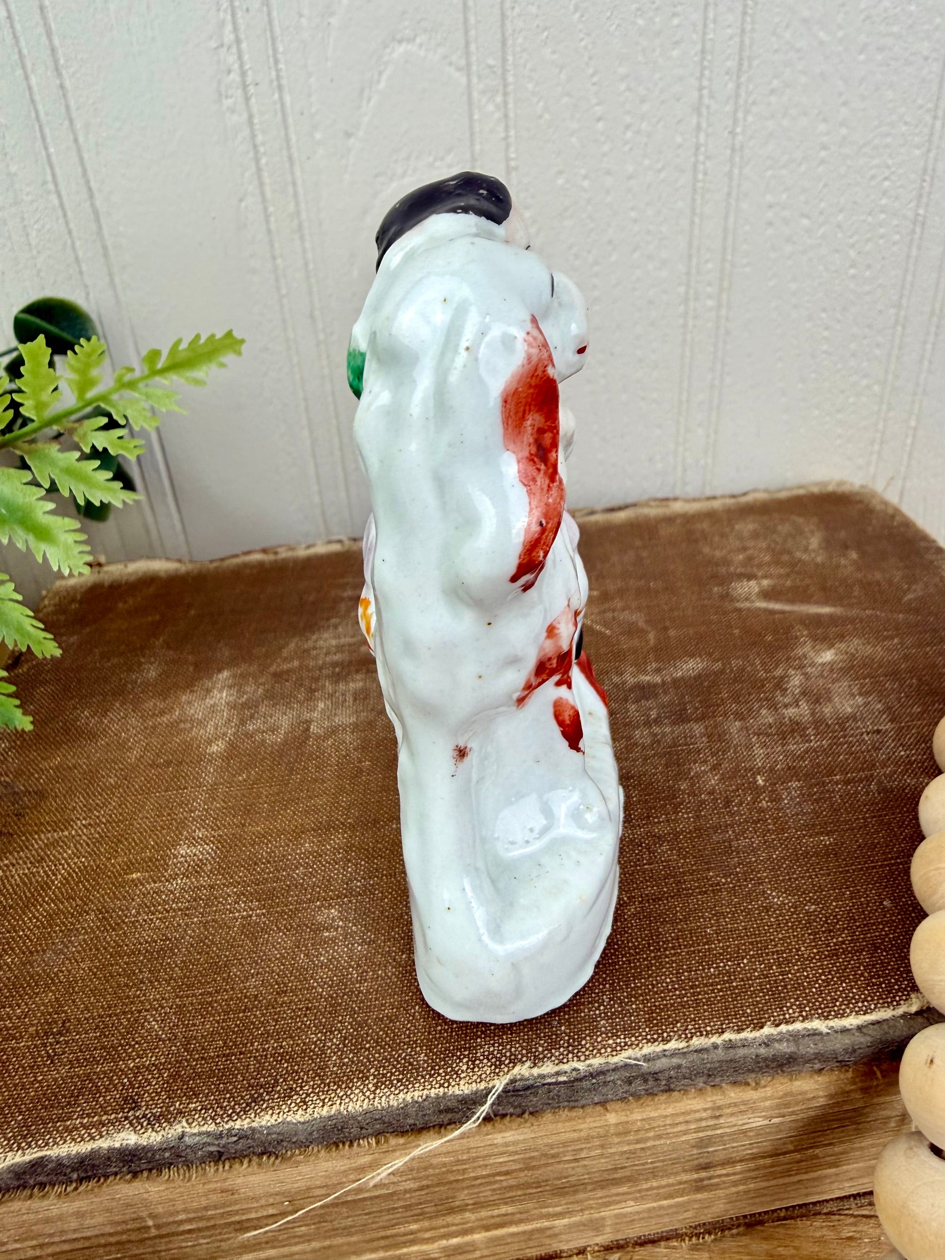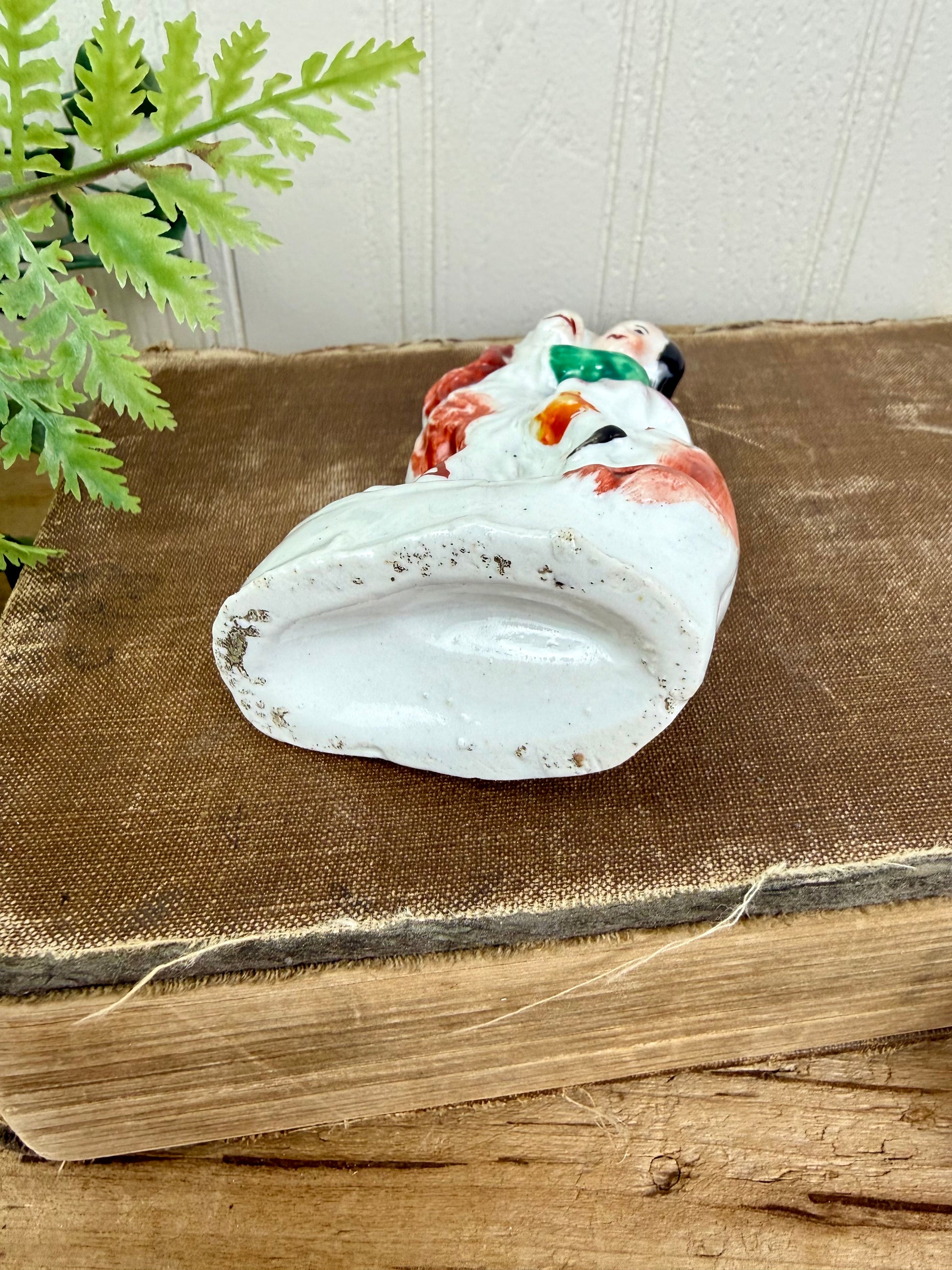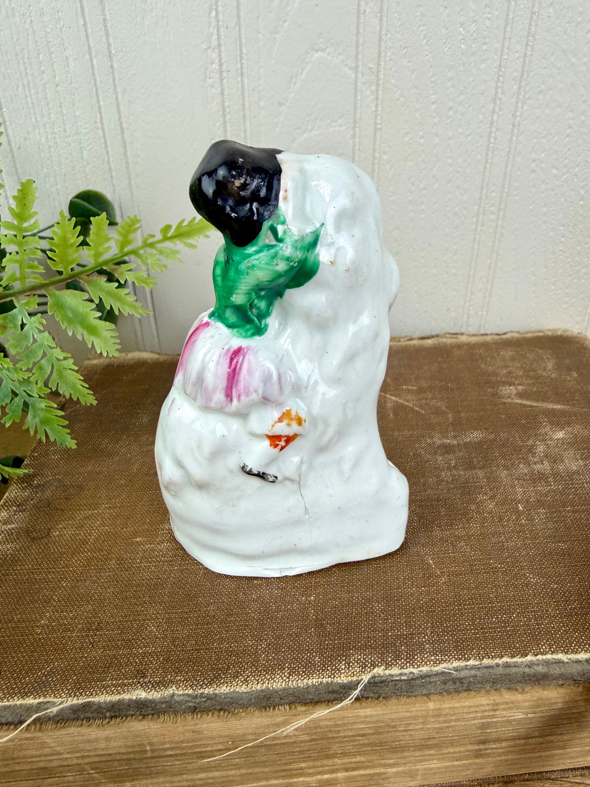 The Antique Staffordshire Victorian Spaniel & Child Figurine is a mid-to-late 19th-century piece, showcasing a child and spaniel—a prevalent motif in Victorian Staffordshire ceramics. Crafted in England, it reflects the era's artistic focus on familial and animal companionship, making it a valuable addition for collectors of historic pottery.