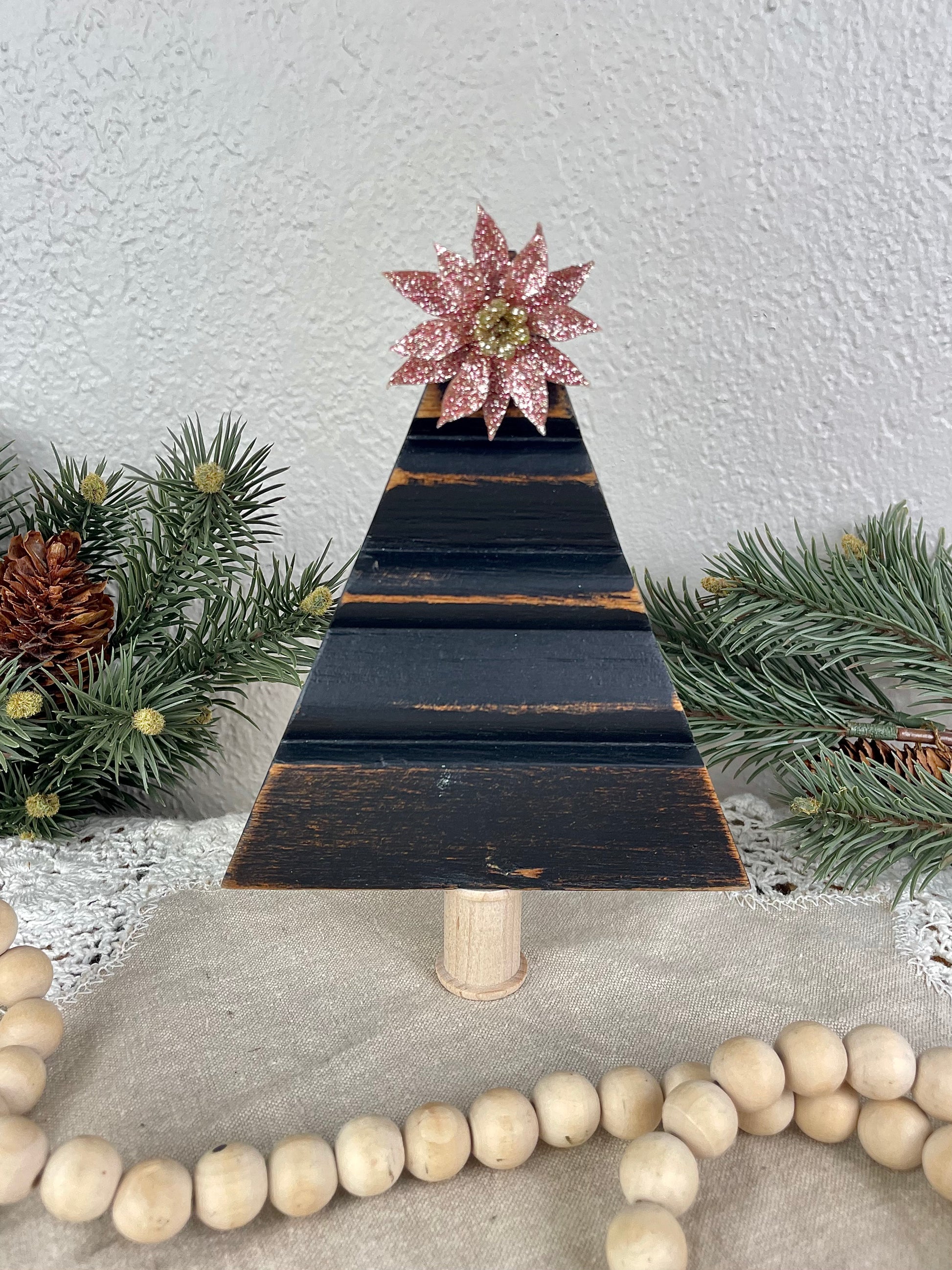 Upcycled Small Vintage Trim Black Christmas Tree with Pink Poinsettia