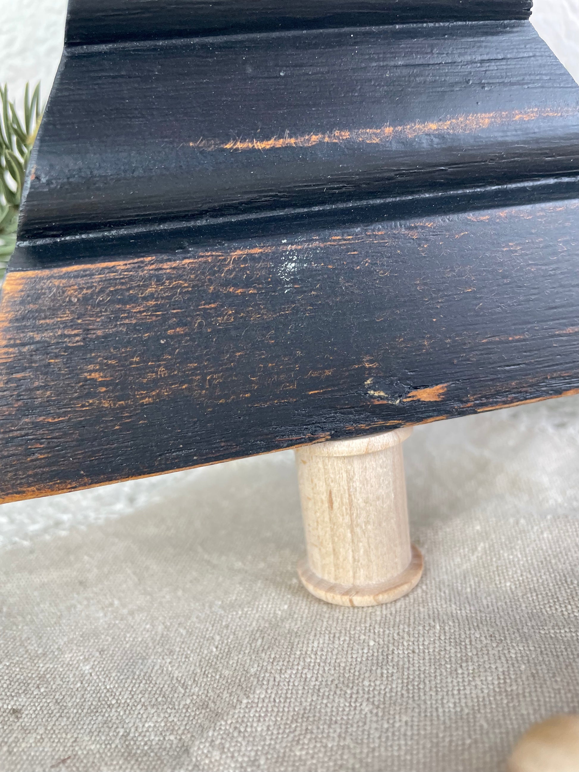 Handmade from reclaimed vintage oak house trim. Painted with chalk paint and distressed for an aged look. Accented with a flower and a vintage spool for the tree trunk. Made to stand up on it’s own on a shelf or table top.