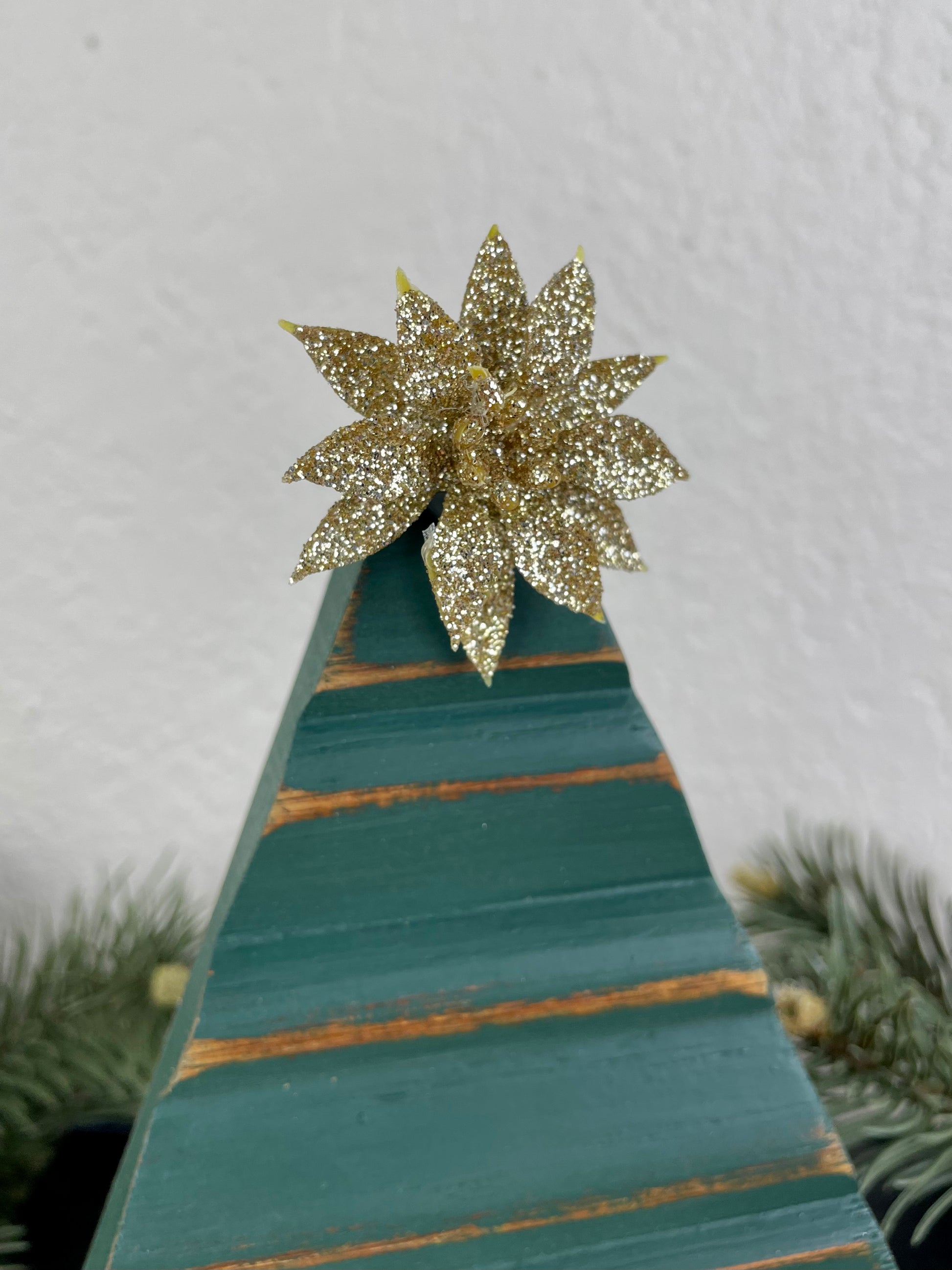 Upcycled Small Vintage Trim Forest Green Christmas Tree with Gold Poinsettia