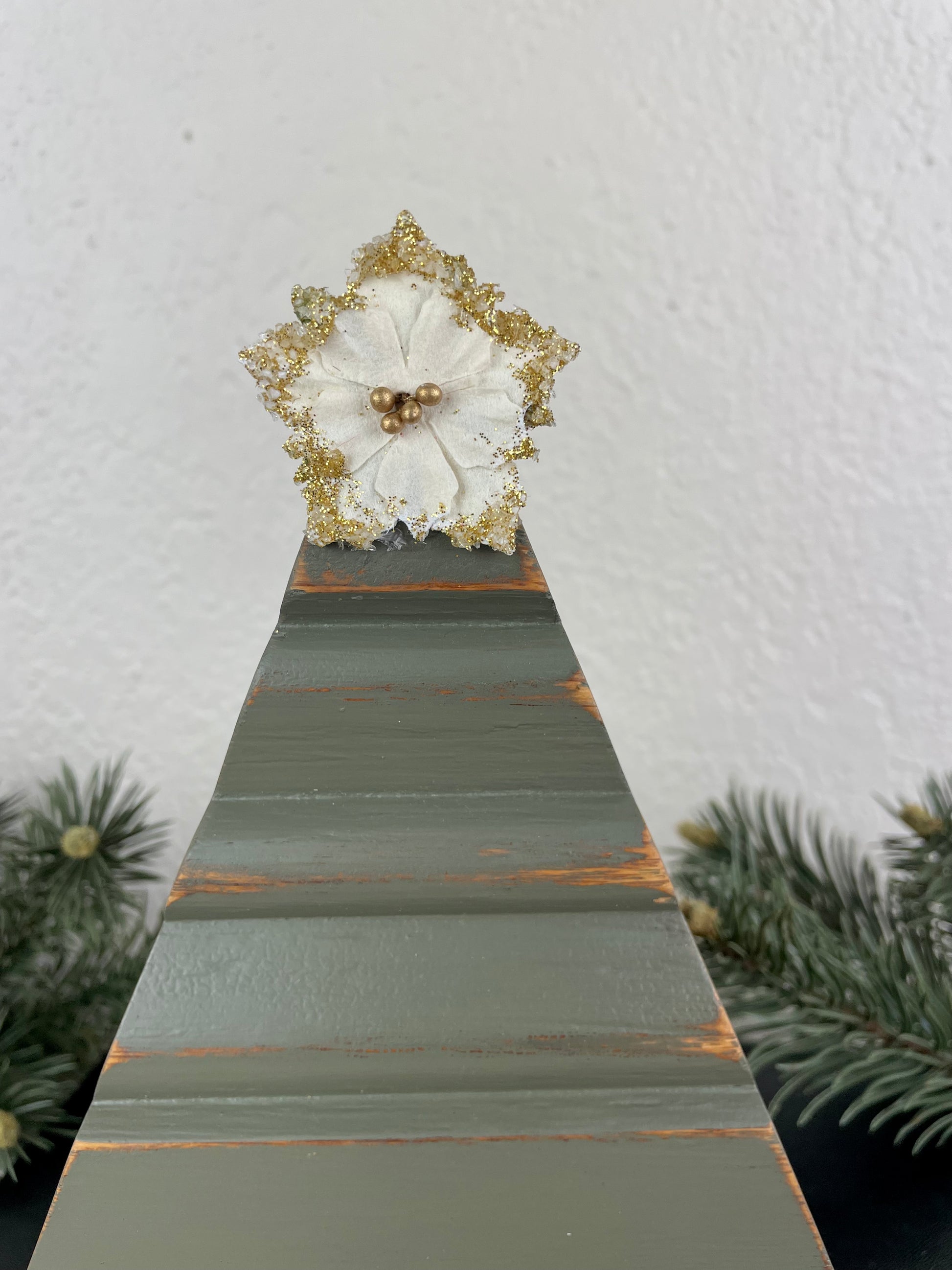 Upcycled Small Vintage Trim Green Christmas Tree with White Poinsettia