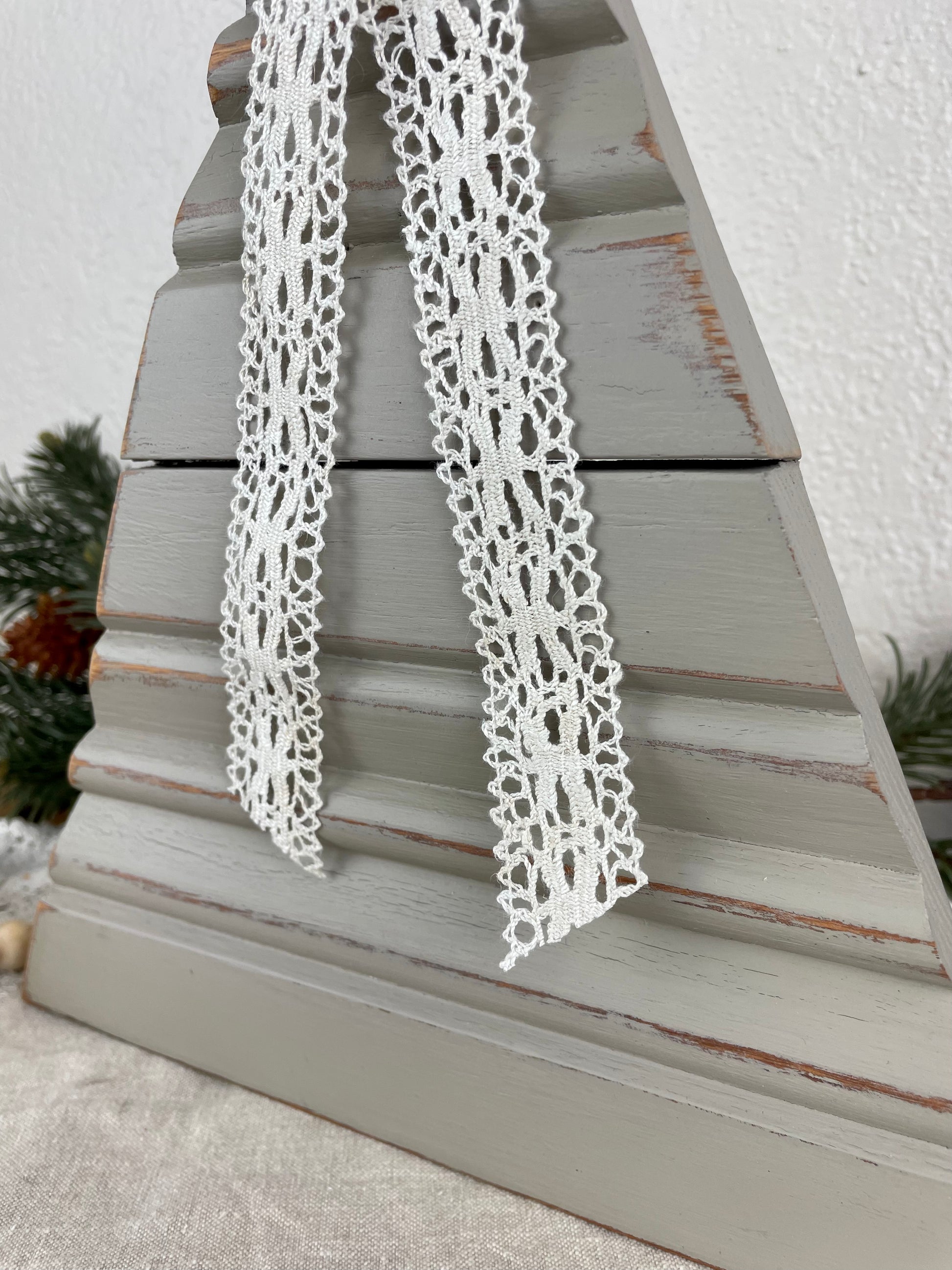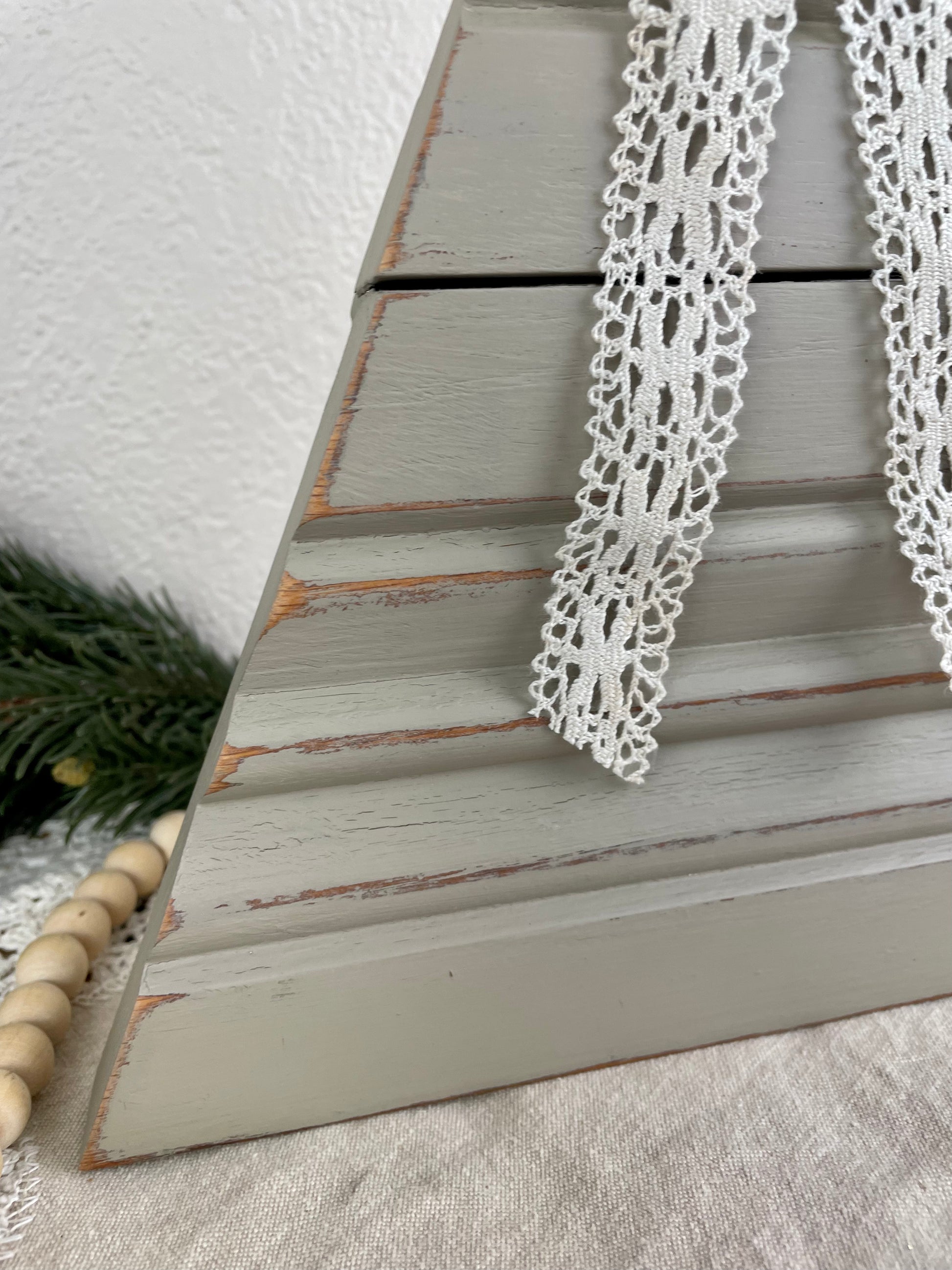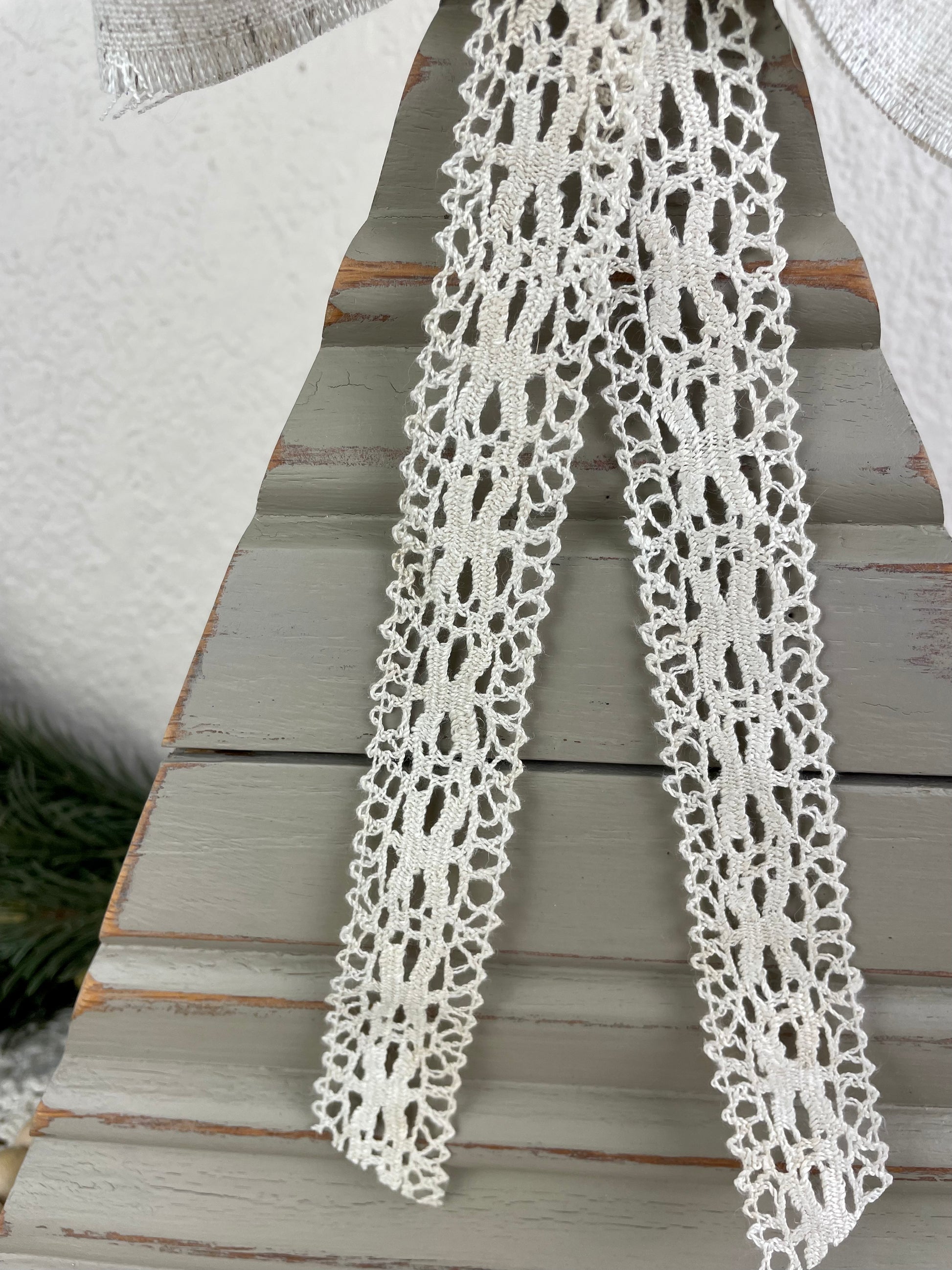 Handmade from reclaimed vintage house trim. Accented with a handmade bow and vintage lace accents. Made to stand up on it’s own on a shelf or table top.