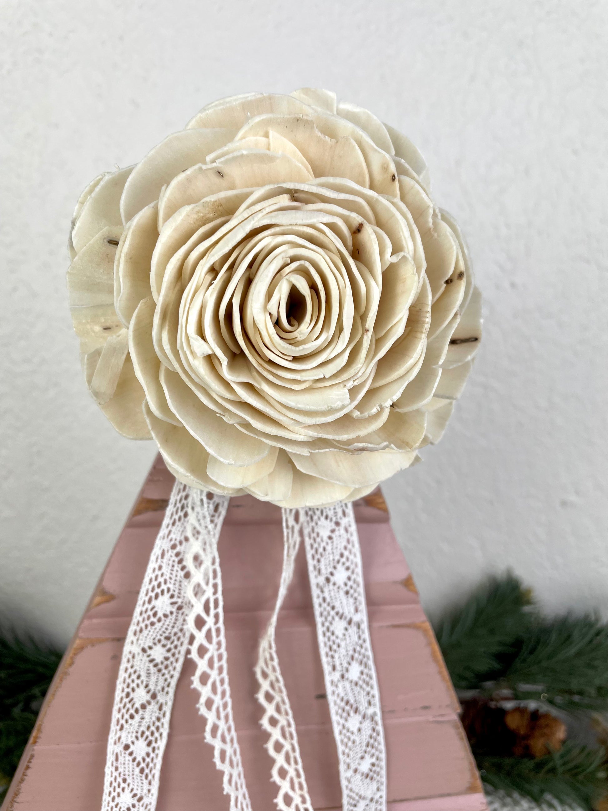 Handmade from reclaimed vintage house trim. Accented with a woof flower and vintage lace accents. Made to stand up on it’s own on a shelf or table top.