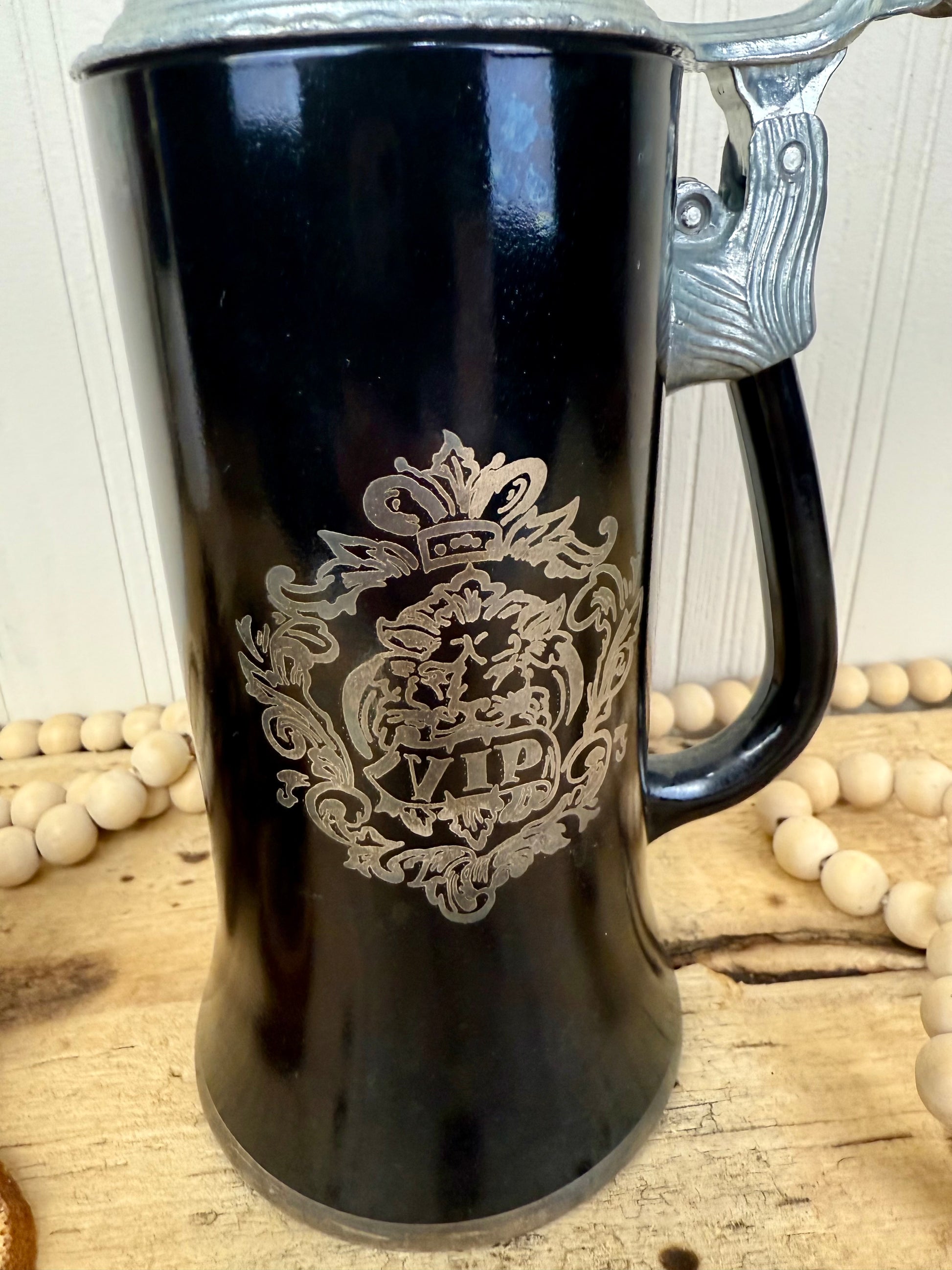 The Vintage German VIP Beer Stein is a collector's dream, complete with a unique “VIP” crest on the front and a beautiful love poem on the back. Crafted in Germany with a pewter lid, this glass beer stein is a classic piece of breweriana that celebrates the rich history and artistry of German beer culture. A must-have for any beer enthusiast or collector.