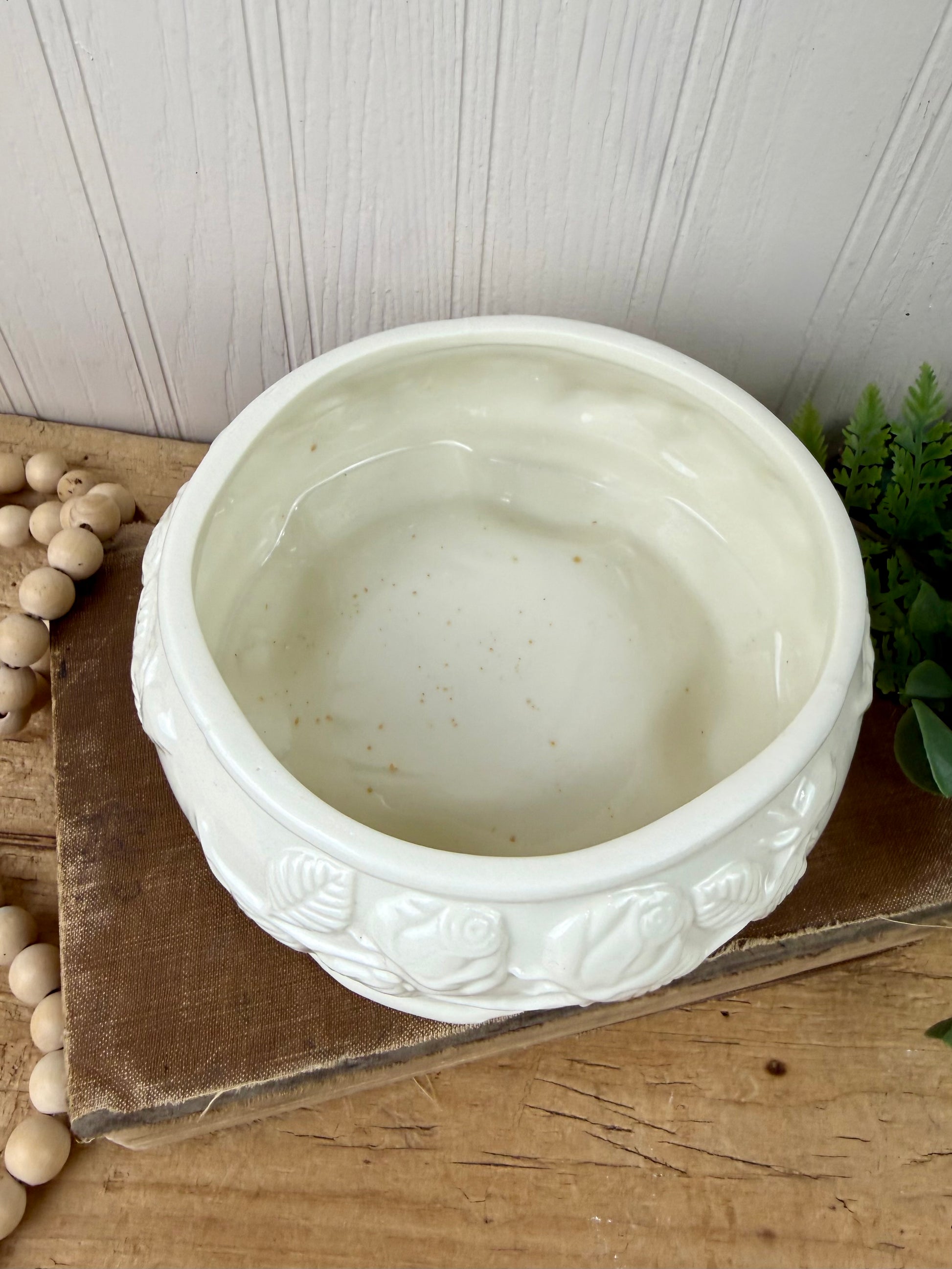 Add a touch of vintage charm to your space with this ceramic footed planter bowl adorned with a beautiful raised rose pattern. Perfect for showcasing succulents or storing small trinkets, it brings warmth and personality to any room while embracing its unique character. Does have some age marks on the inside (pictured).