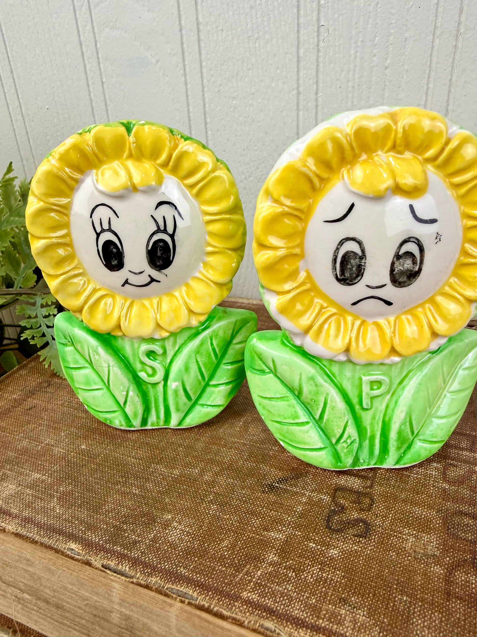 Vintage Ceramic Happy/Sad Sunflower Salt & Pepper Shaker Set
