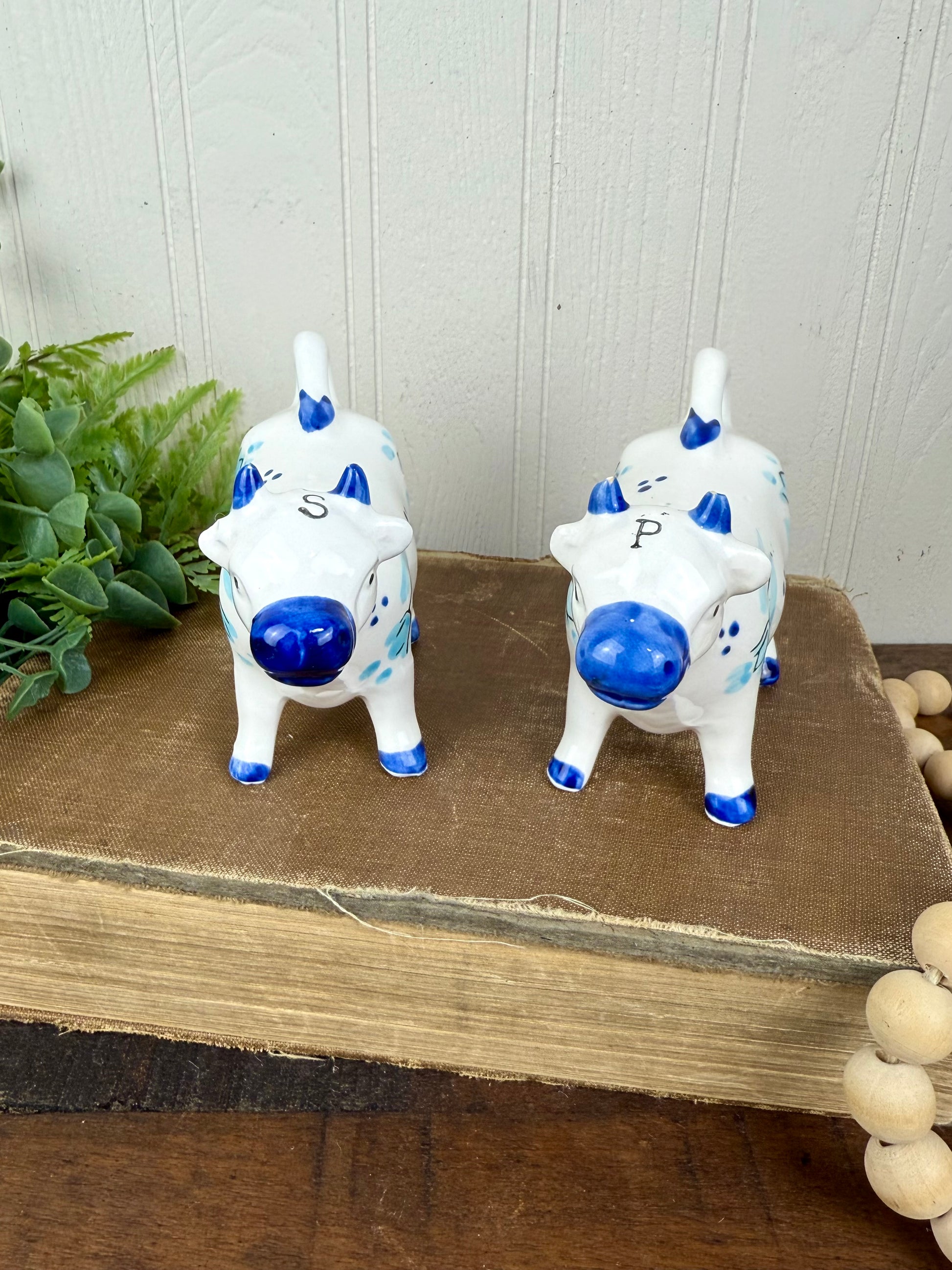 Vintage Enesco Delft-Style Porcelain Cow Salt and Pepper Shakers