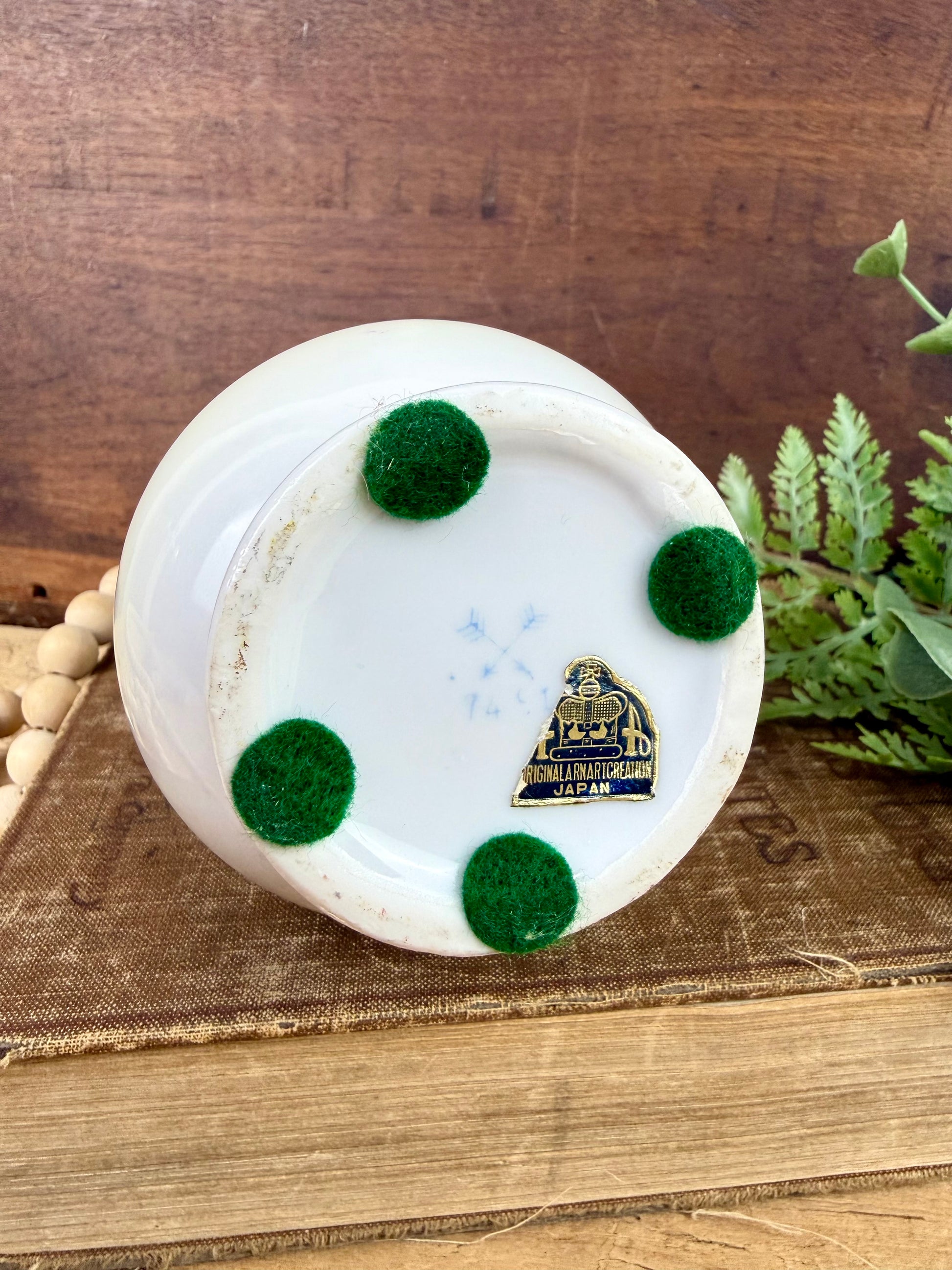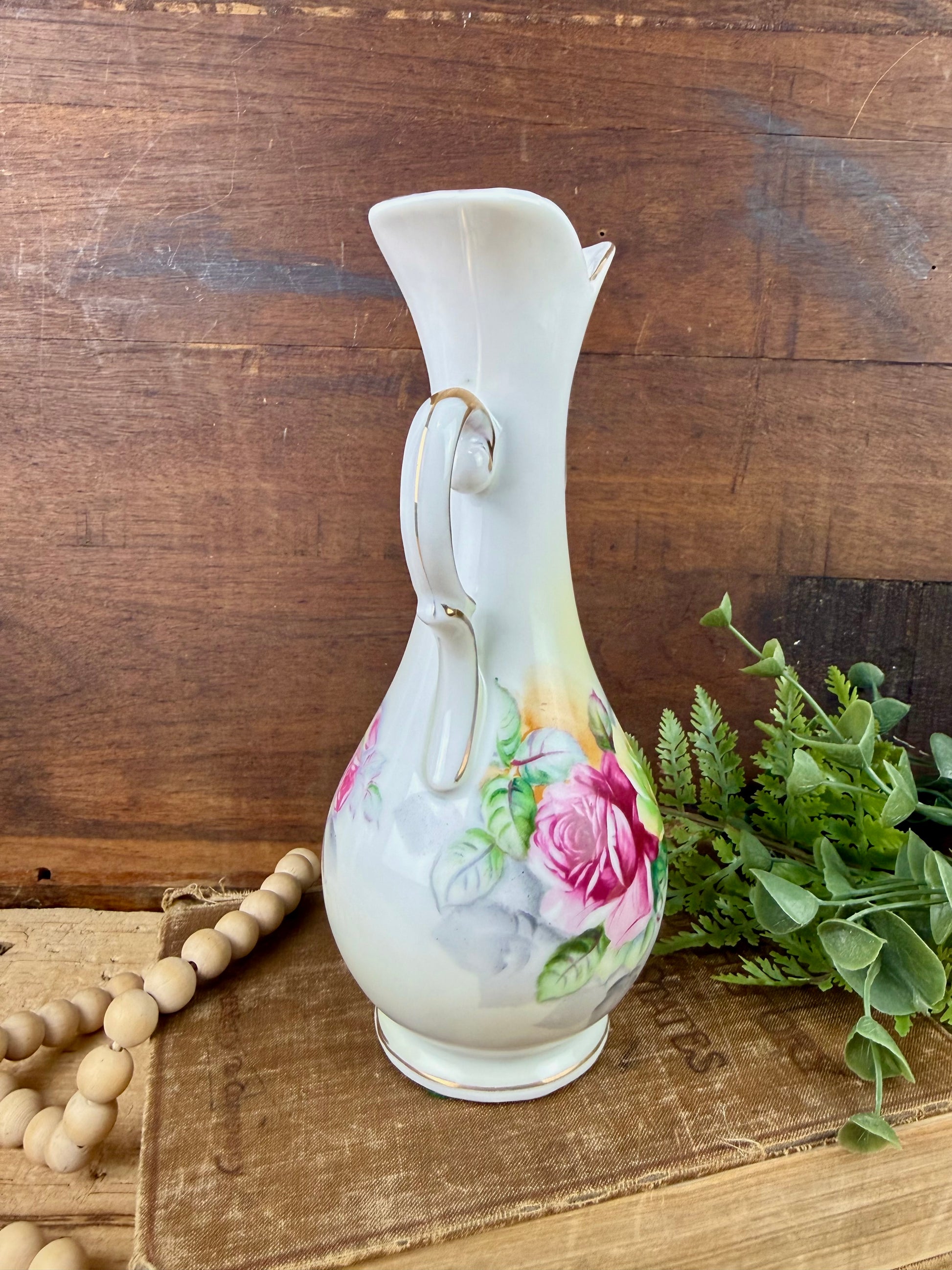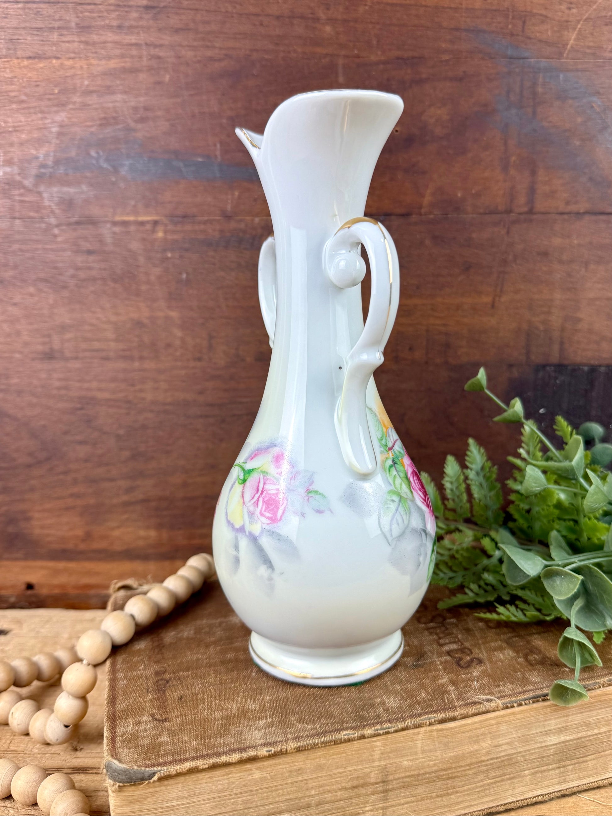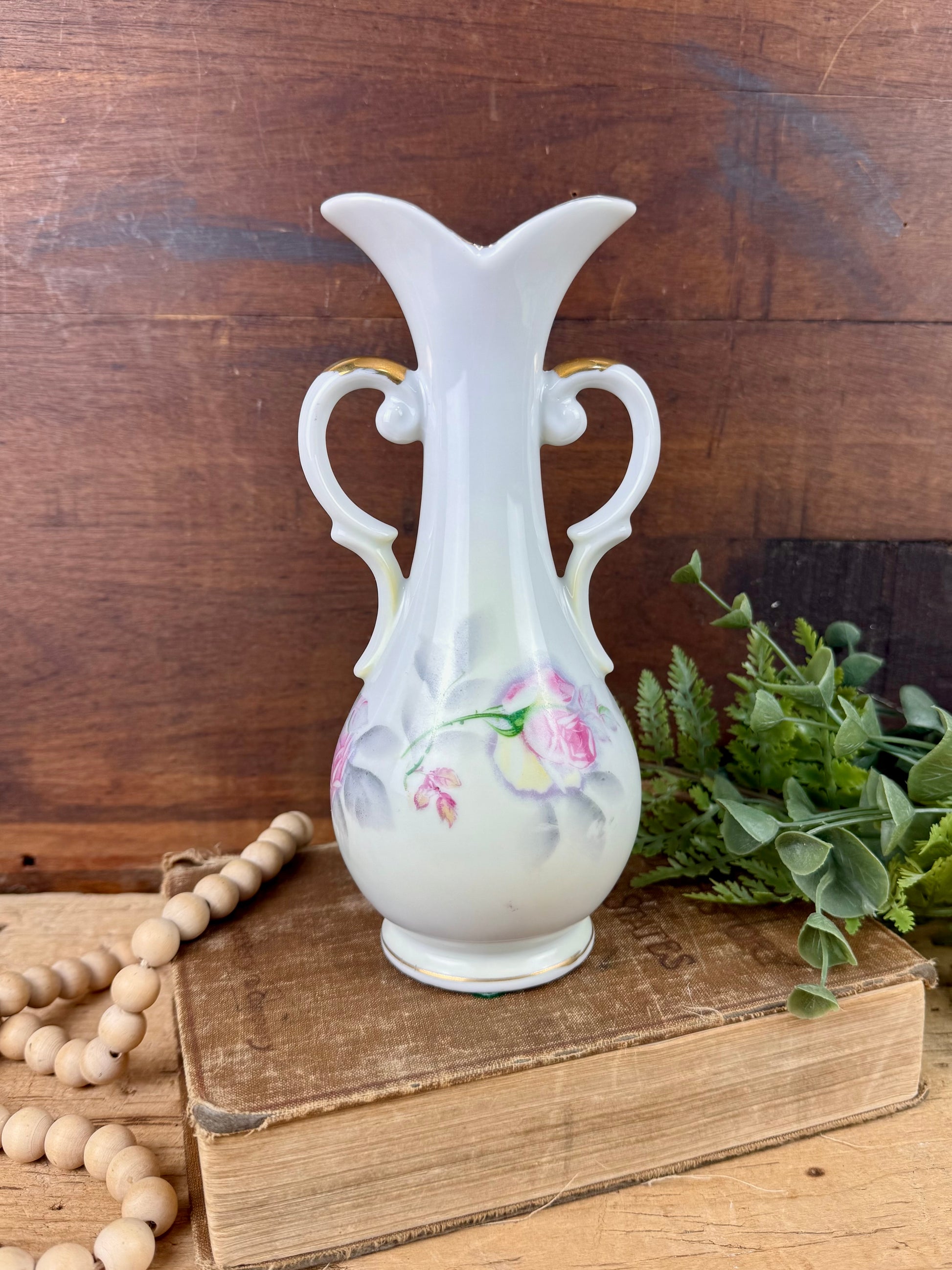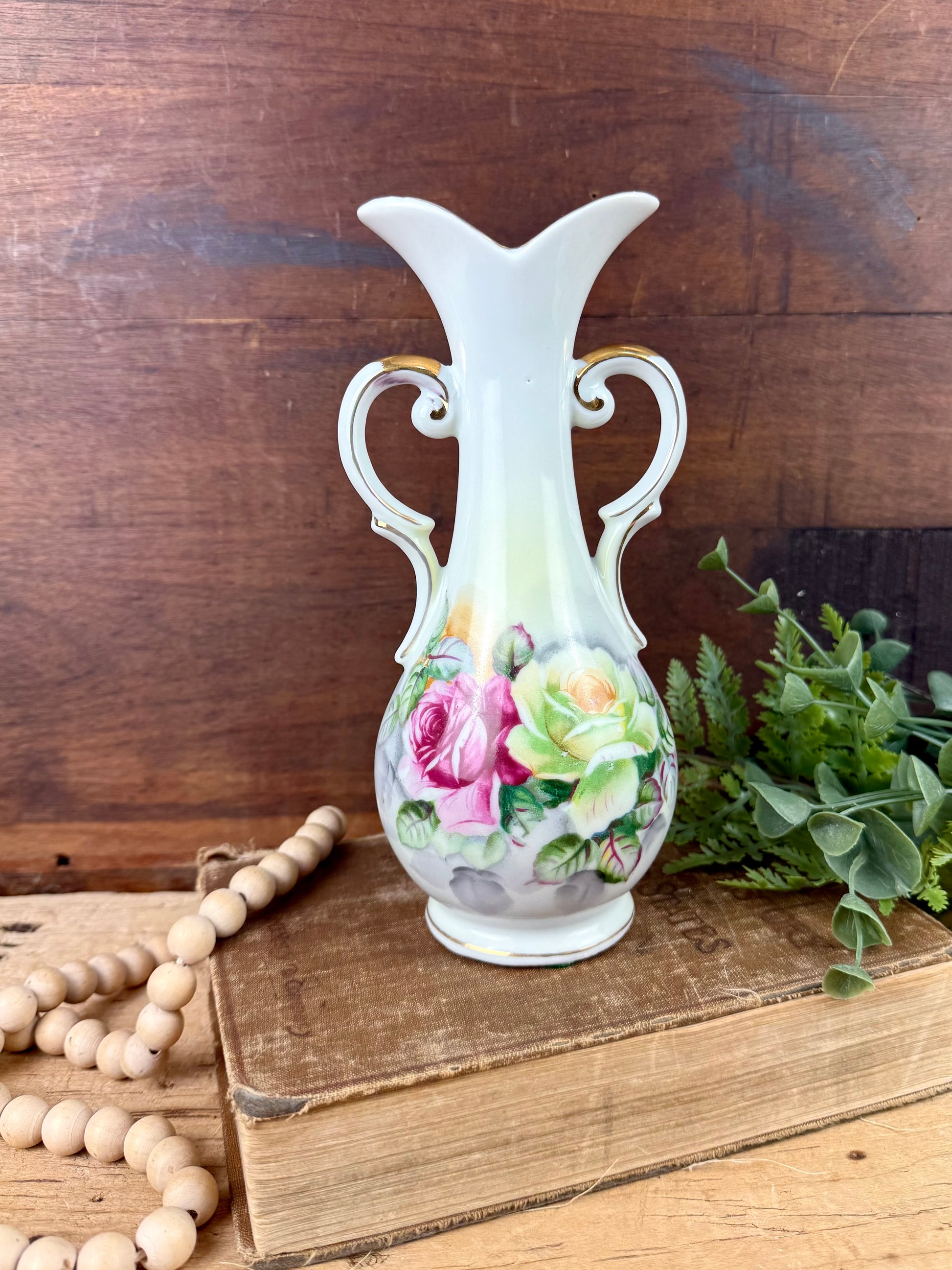 This gorgeous double handled porcelain flower vase was made in Japan by Arnart sometime in the 1950s - 1960s. The vase has a beautiful shape, hand painted roses all around the middle, and stunning metallic gold accents. It is not a large vase, but it makes a statement nonetheless. This would be lovely on a mantle, side table, vanity or dresser to add some mid-century, cottagecore charm to your decor.
