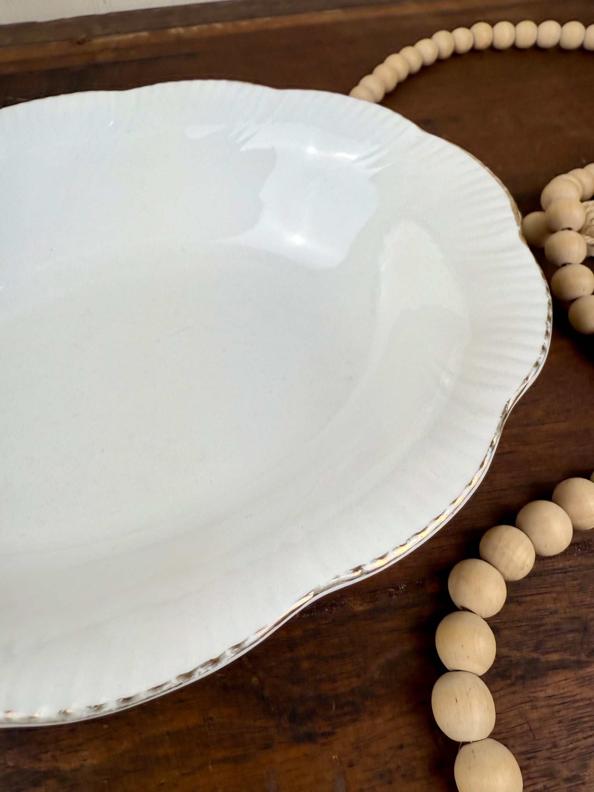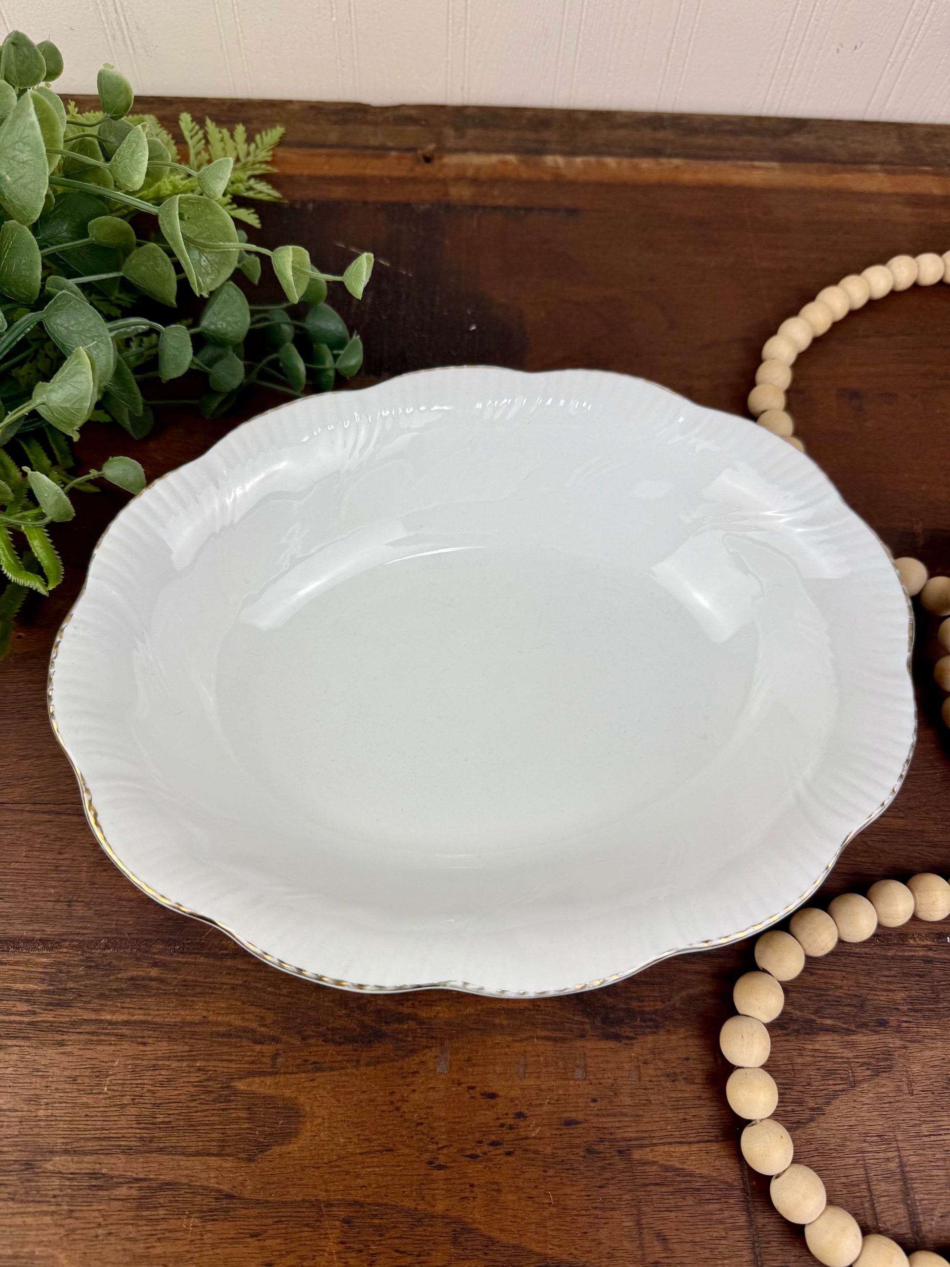 Experience elegance with the Vintage Queen's Fine Bone China Oval Serving Bowl. Made by the established Rosina China Co. Ltd. in England, this "Marie" pattern piece features a classic swirl design and scalloped edges with delicate gold trim. Elevate any dining experience with this timeless and high-quality serving bowl.